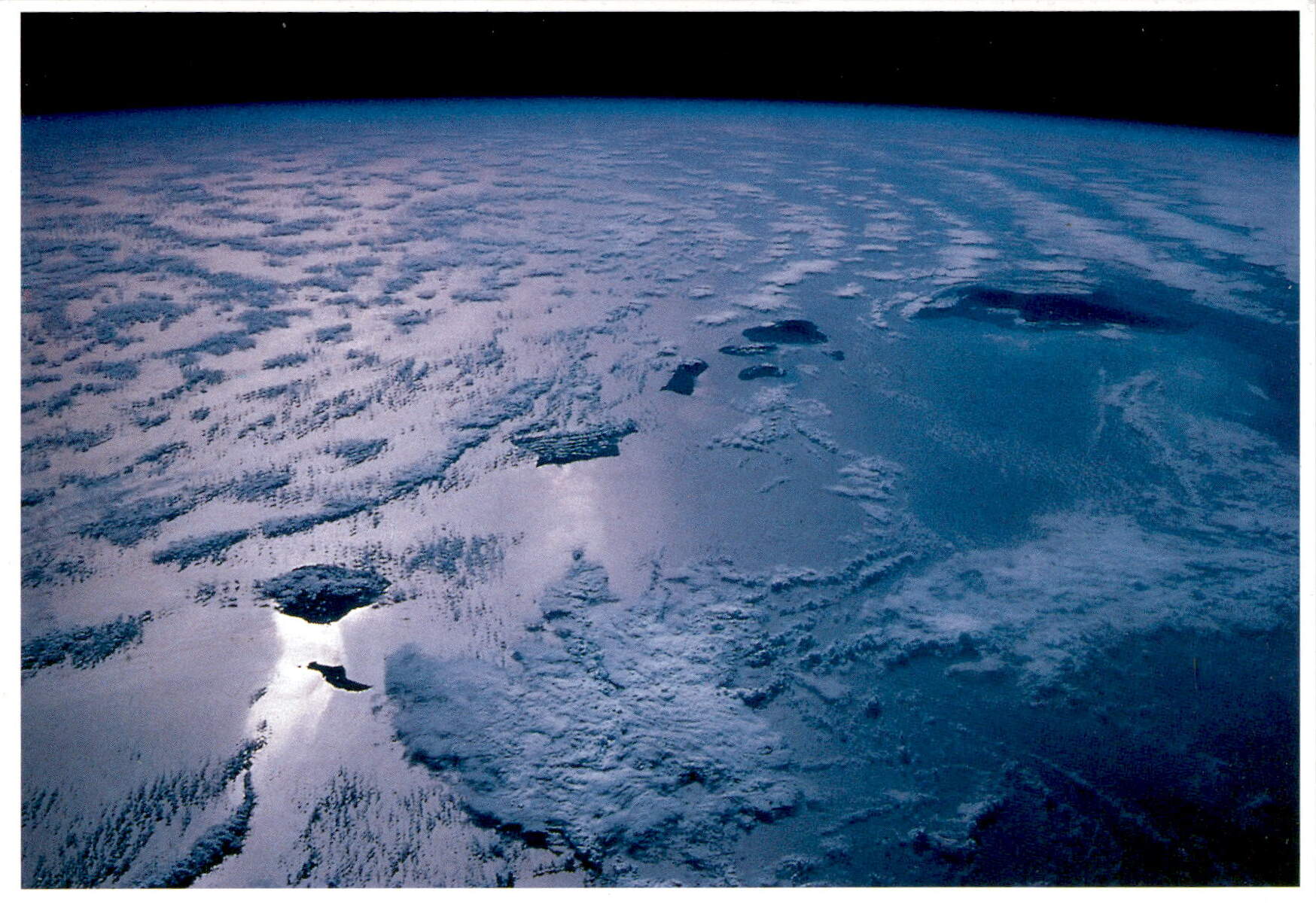 This postcard features a stunning view of the entire Hawaiian Island chain as seen from the Space Shuttle. The image shows the curve of the Earth and the blackness of outer space. In the foreground, you can see Niihau and Kauai, followed by Oahu, Molokai, Lanai, and Maui. The Big Island can be seen in the distance. The photo was taken by NASA and is copyrighted by Hawaiian Resources Co Ltd. The postcard is printed in Hong Kong and can be purchased from MailOrderHawaii.com.