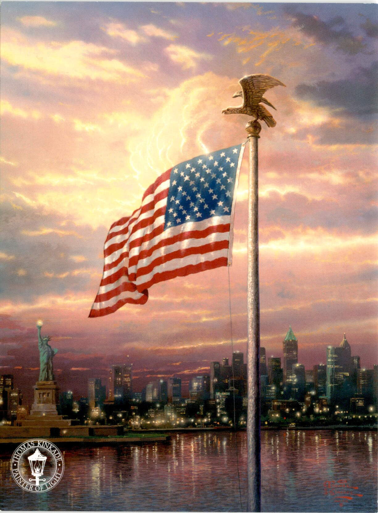 The Light of Freedom is a painting by Thomas Kinkade that showcases his faith in God, love for humanity, and pride in America. The image features billowy clouds in the sky, symbolizing that despite challenges, God has blessed this land. This postcard is available in two sizes: 16″ x 12″ and 24″ x 18″. It is a beautiful representation of Kinkade’s artistry and his appreciation for America.