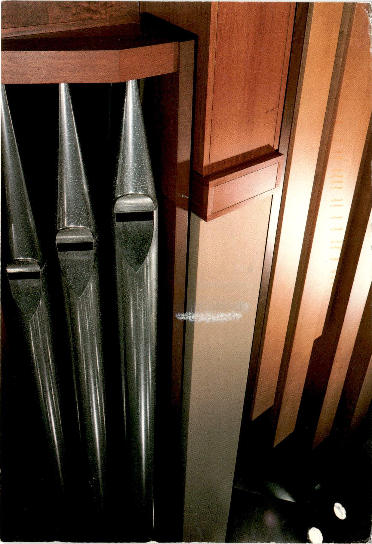 The vintage postcard is focusing on the image of the null Watjen Concert Organ in Benaroya Hall, home of the Seattle Symphony in Seattle, WA. The postcard mentions attending a concert featuring flutist James Dalway and his wife. The sender also comments on the beauty of the weather and mentions that the organ is good at home as well. The postcard also briefly mentions the sender’s activities with their grandchildren and the children’s involvement in playing the violin and baseball.