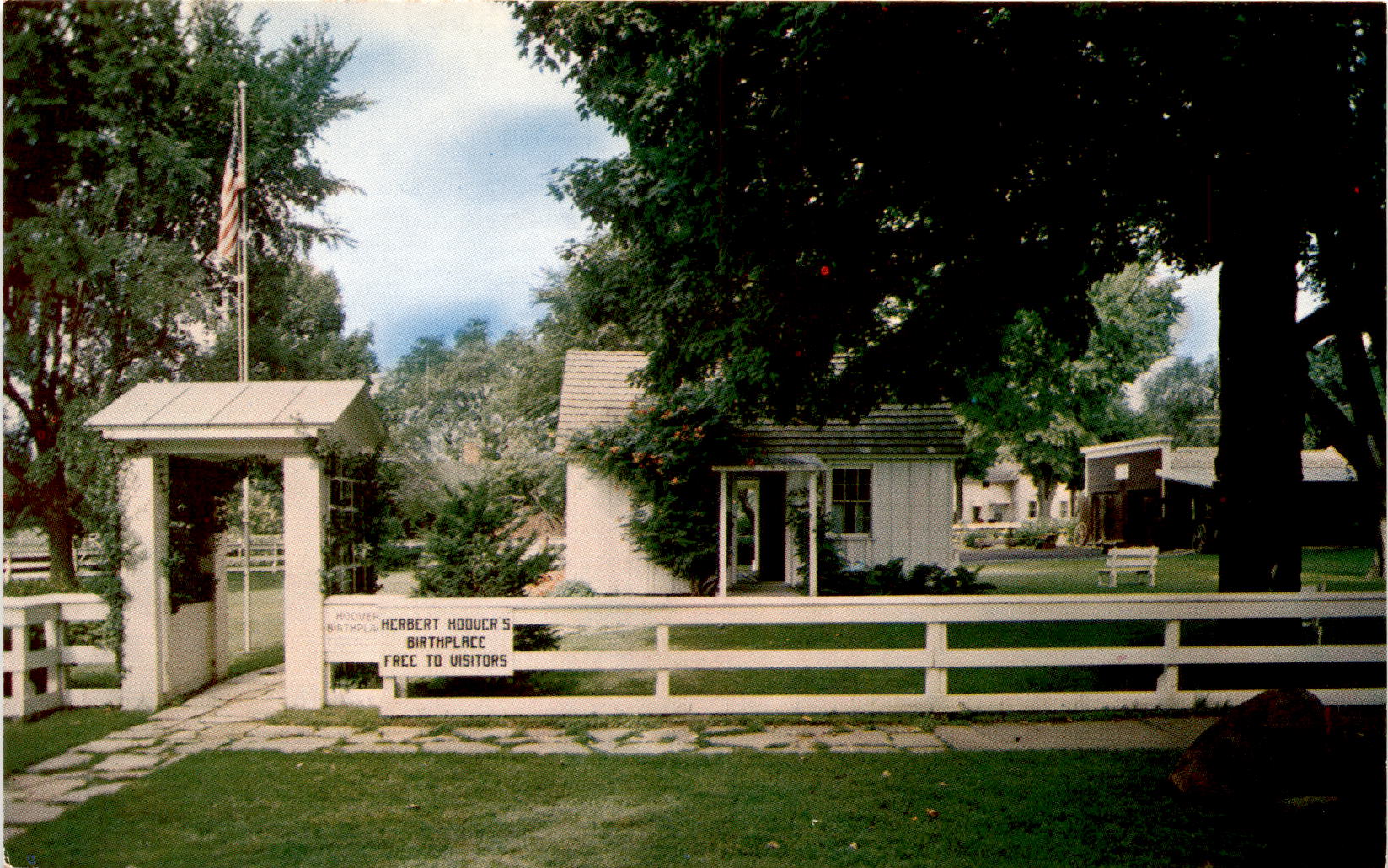 The vintage postcard is focusing on the birthplace of Herbert Hoover, which is located in West Branch, Iowa. The image on the postcard is most likely a place, showcasing the natural color of the birthplace. The postcard also mentions that it is free for visitors to visit. The postcard is produced by Mike Roberts in Berkeley, California, and the photos are from Es-N-Len Photos in Aurora, Illinois.