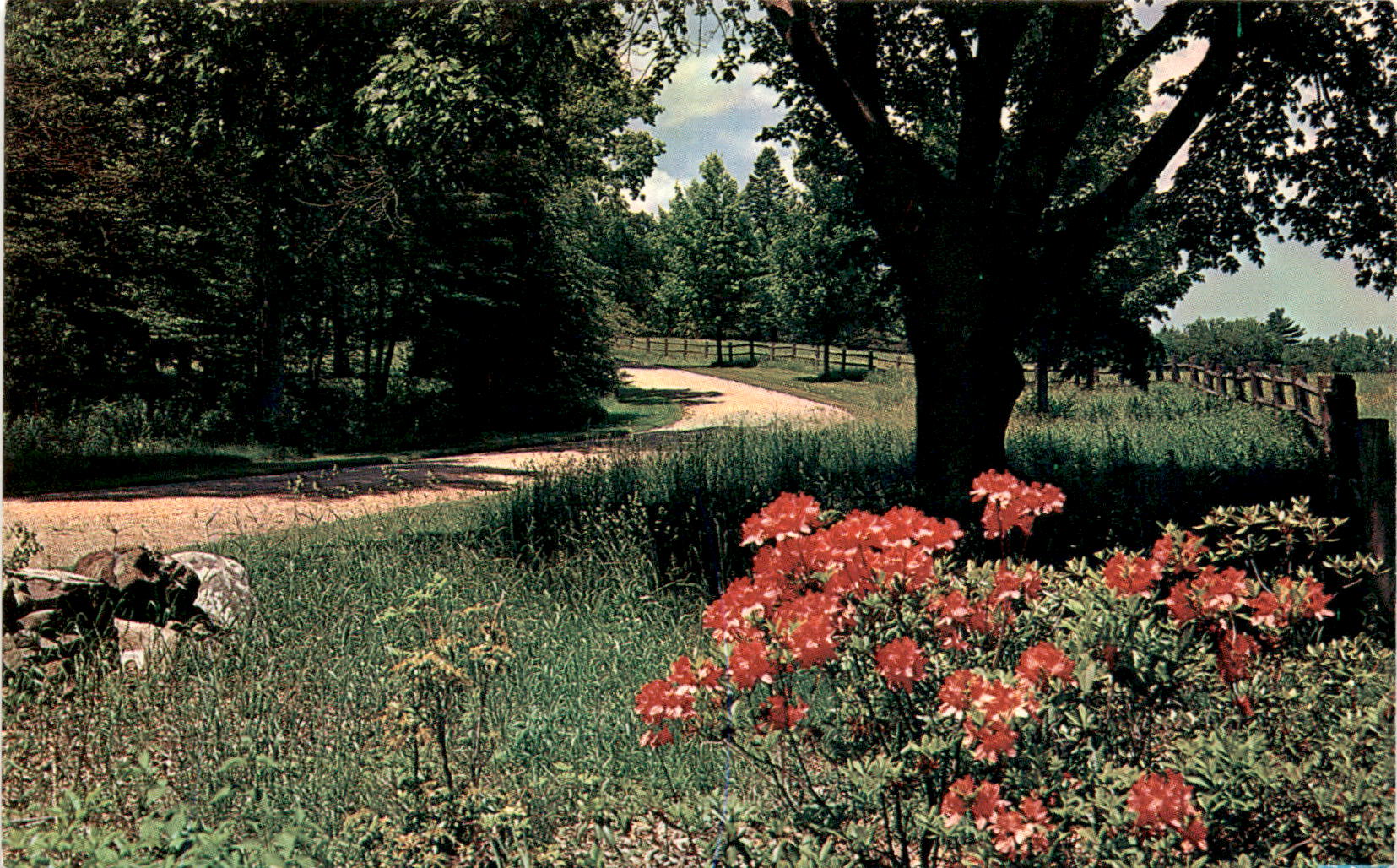 This vintage postcard focuses on the image of a country lane in Ballston Spa, New York.
