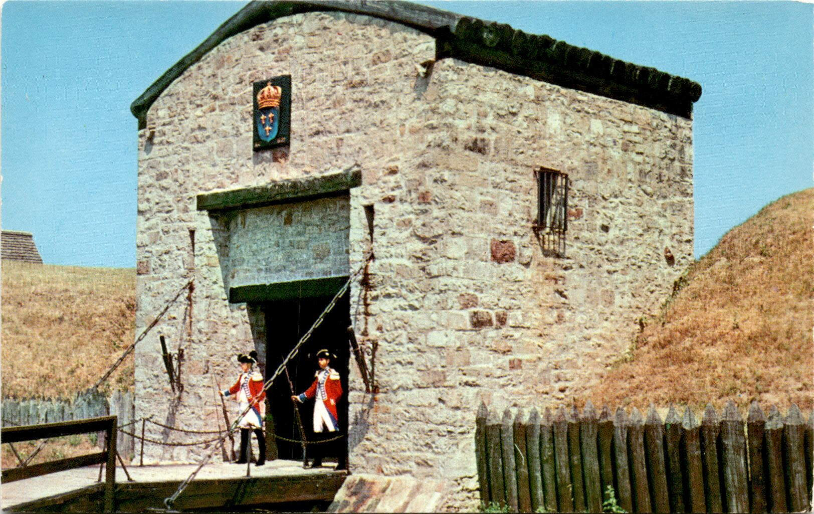 The vintage postcard focuses on the drawbridge and gate of the Five Nations at Old Fort Niagara in Youngstown, New York. The gate was named by the last French commandant to please the Five Nations of the Iroquois Confederacy. The drawbridge is described as complete with chains, windlasses, and counter-balance weights of stone. The postcard also mentions that Old Fort Niagara, which was built in 1726, is open to visitors year-round.