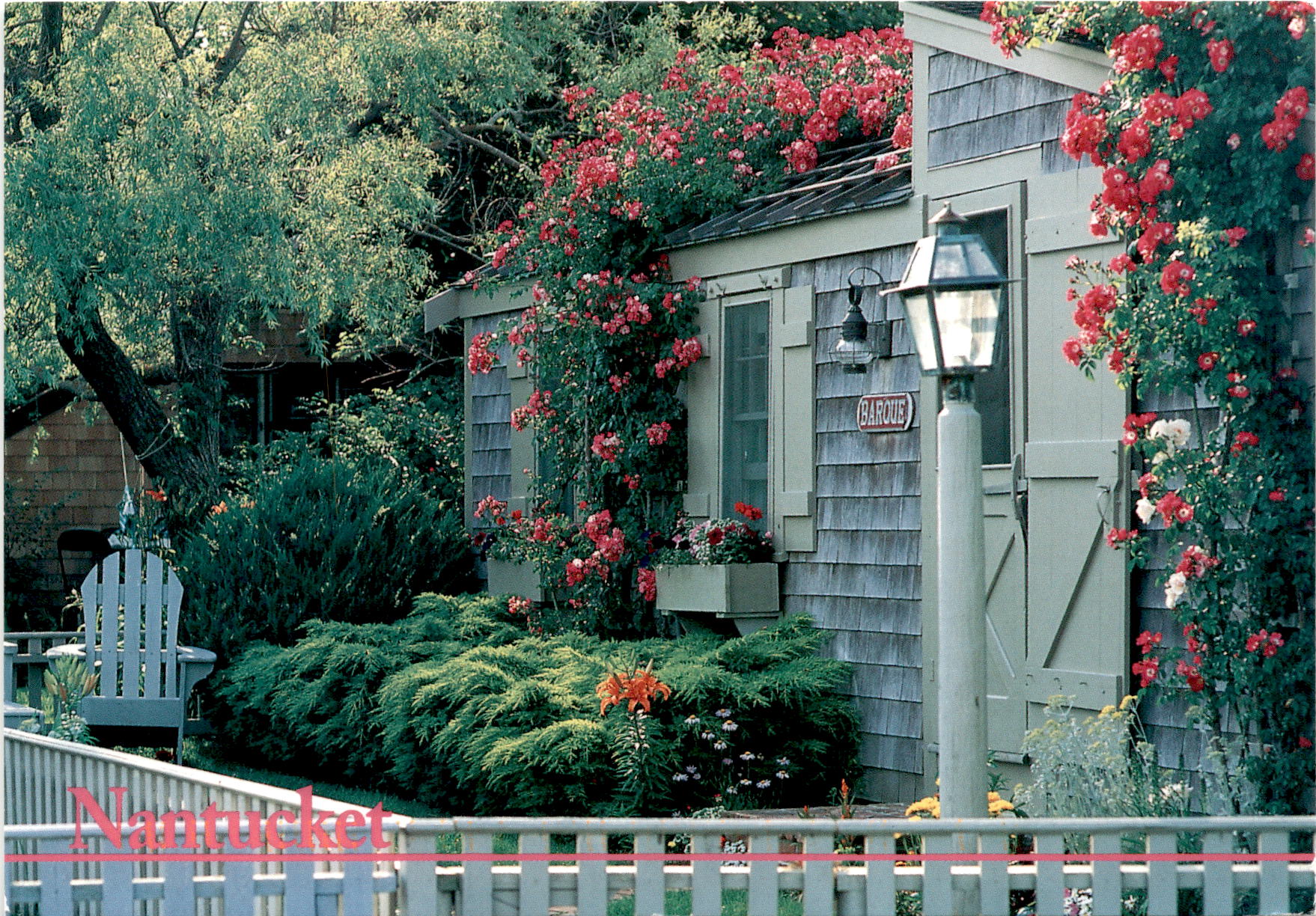 The vintage postcard is focusing on a place, specifically Sconset Cottage on Nantucket Island. The text mentions being on the island since the 9th, being invited and cared for, and expressing love for the recipient. The image on the postcard is not described in the text.