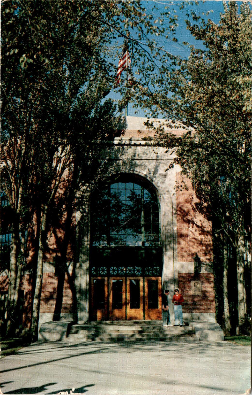 The vintage postcard is focusing on the General Motors Institute in Flint, Michigan. It provides information about the history and growth of the institute, as well as its current status as a top industrial education facility. The postcard also mentions the sender’s plans to drive to Toledo and Cave Tuesday.