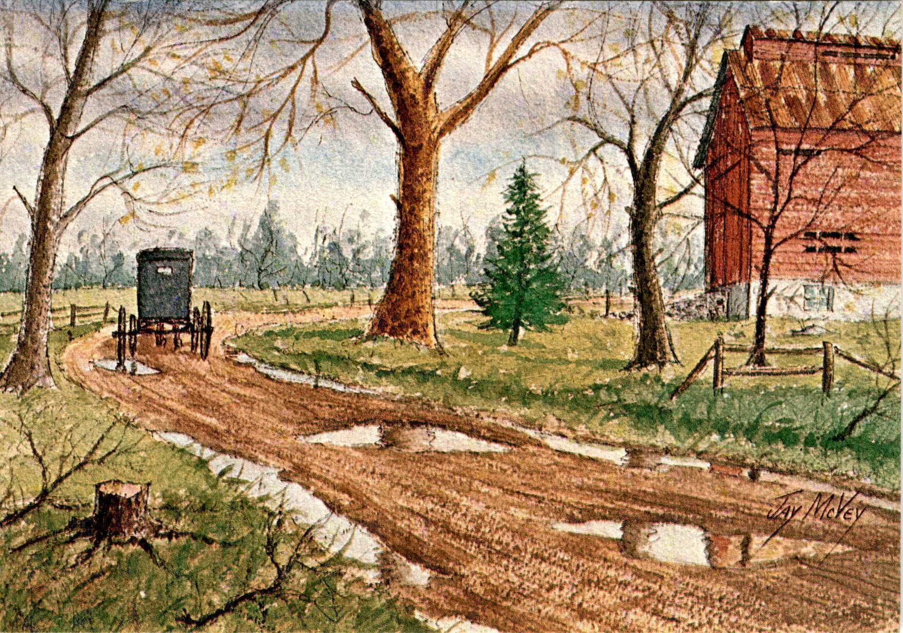 This postcard features a watercolor painting titled “After the Rain” by Jay McVey. The artwork depicts an Amish Family Carriage passing by a red tobacco barn in the Dutch Country. The postcard is published by STEL-MAR and has the address of 329 Rhoda Dr. in Lancaster, Pennsylvania. It is a DA-5 size postcard and requires postage.