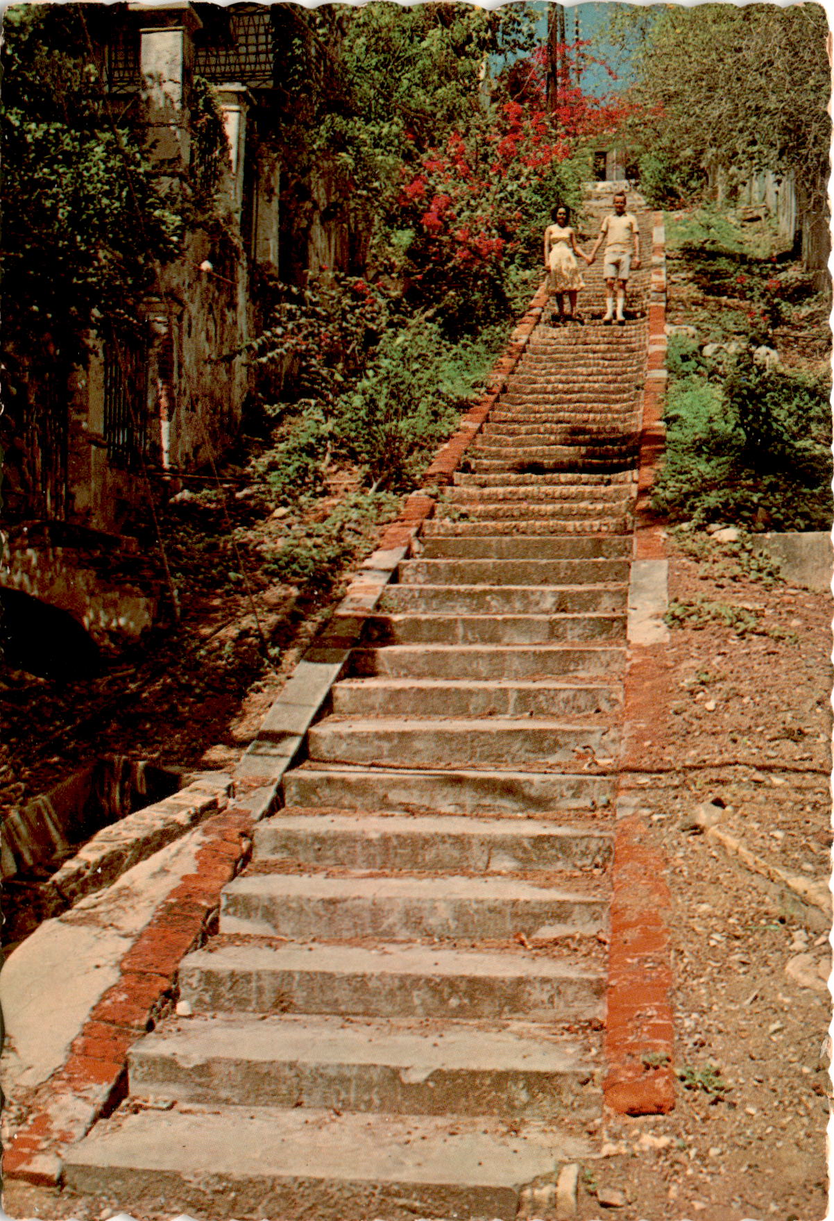 This postcard from St. Thomas, Virgin Islands features the iconic Ninety-nine Steps, which are more admired by visitors than by locals. The postcard, colorized by Larry Witt, captures the beauty of the place. The sender expresses a desire to return to San Juan for the weekend and mentions Mr. Wer Donnie Ducher. The postcard is signed by David Chrobaks in 1964. It holds sentimental value as a collector’s item, showcasing social and cultural aspects of the time. The postcard was printed in the USA by Dexter Press, Inc. in 1968. It serves as a reminder of love and memories, making it a cherished piece for those interested in history and nostalgia.