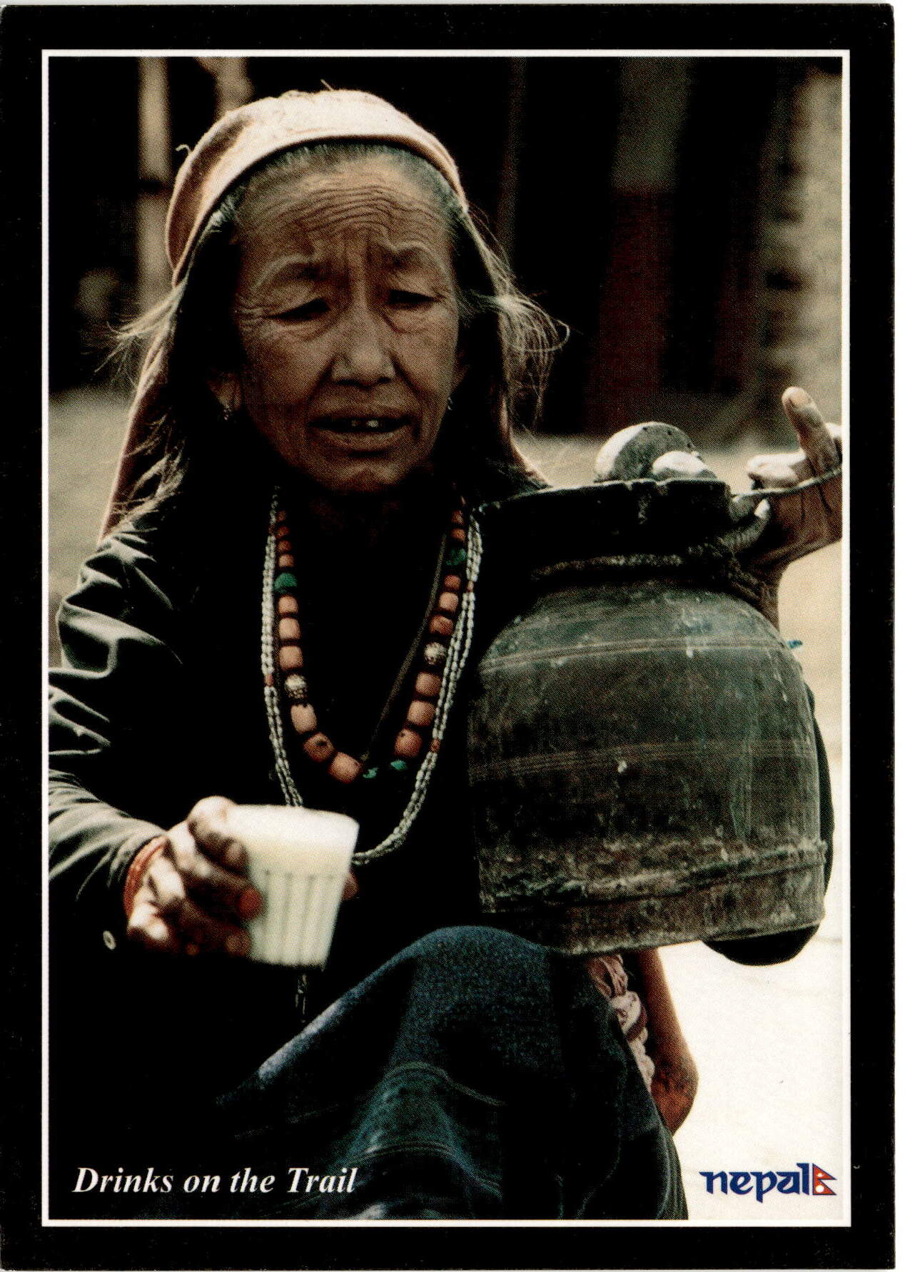 The postcard highlights the cultural significance of Mohi, a common drink in Nepal made from diluted whey, which is popular among people on the trail. This traditional beverage holds social value as it is a staple drink for many Nepalese people and is often consumed alongside alcohol. The postcard also emphasizes the importance of the people and places in Nepal, showcasing the faces of the locals who are likely involved in the production and consumption of Mohi. Overall, the postcard captures the essence of Nepalese culture through its depiction of a popular drink and the people who enjoy it, providing insight into the social and cultural aspects of life on the trail in Nepal.