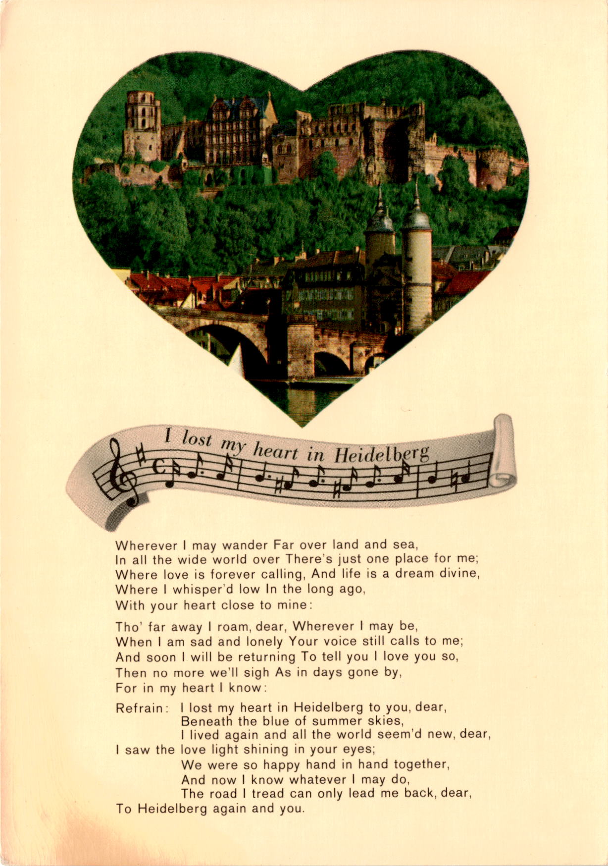The postcard captures the sentimental value of Heidelberg, a place where love and dreams come alive. The lyrics express a deep connection to the city, highlighting the memories of love and happiness shared there. The mention of returning to Heidelberg signifies the emotional attachment and longing for the place and the person associated with it. The blue summer skies and the love light shining in the eyes evoke a sense of nostalgia and romance. The cultural significance of Heidelberg as a symbol of love and happiness is emphasized through the heartfelt lyrics. The postcard serves as a reminder of the social and cultural value of Heidelberg as a place where memories are made and cherished forever.