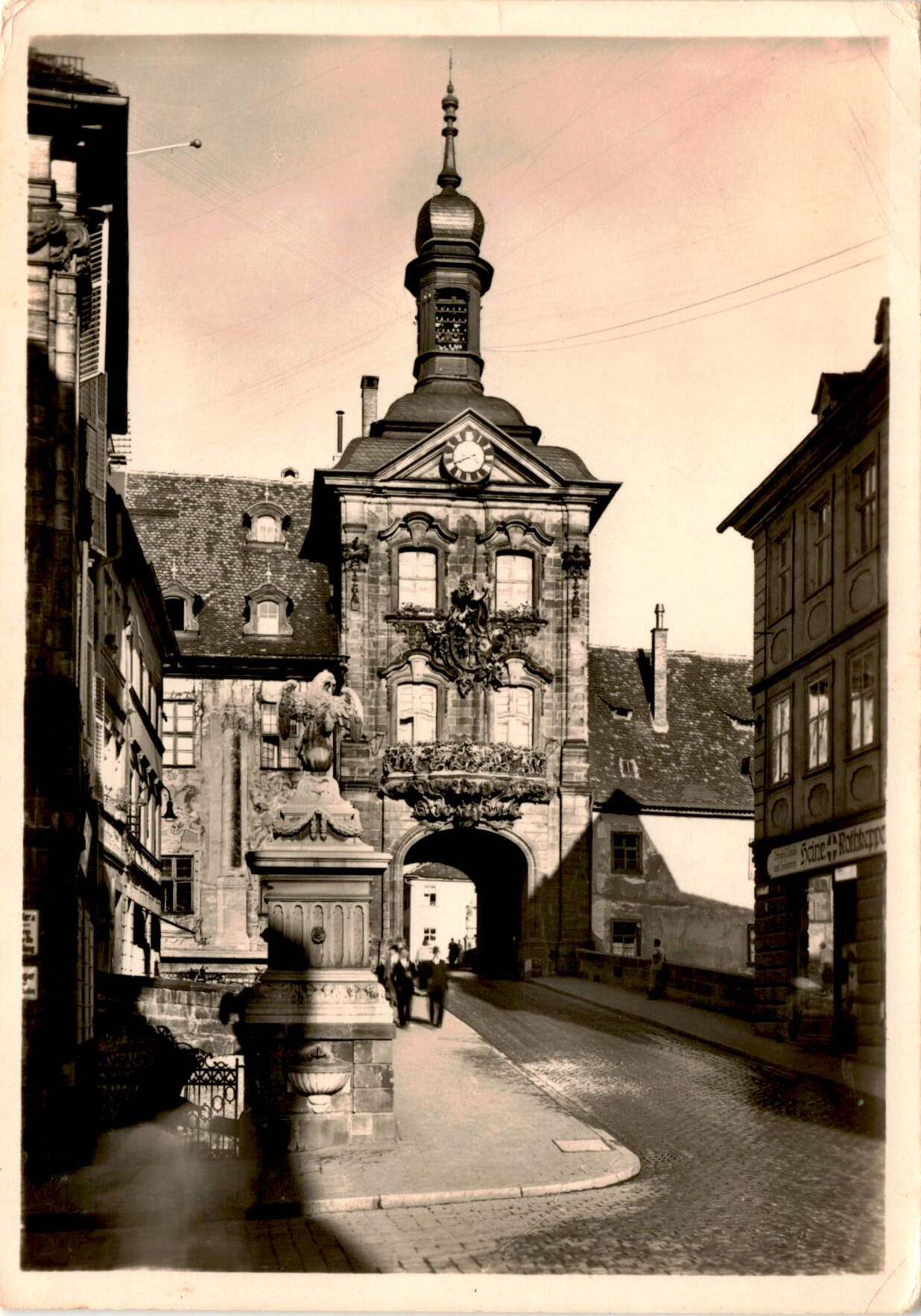 The postcard depicts a picturesque scene in a town with cultural and social significance. The Rathaus in Bamberg, with its gothic bridge tower, stands out as a historical landmark. The mention of walking down the street and admiring the flowers in the garden adds a touch of local charm. The postcard also includes references to art and architecture, such as the beautiful glass and the Deutscher Kunstverlag. The stamp featuring John Adams and the United States postage symbolize connections between different places and cultures. Overall, the postcard captures the essence of a quaint town with rich history and cultural value, making it a valuable addition to any postcard collection.