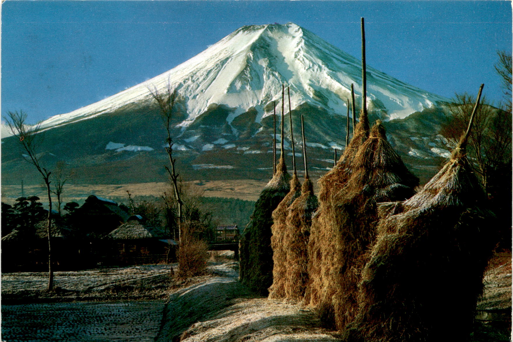 The postcard showcases the cultural and social significance of Mt. Fuji and a farm village in Yamanashi Prefecture, Japan. Mt. Fuji is described as a source of pride for Japan, with its rural landscape and straw-thatched roofs adding to its scenic beauty. The contrast between the straw-thatched roofs and the perpetual snow on Mt. Fuji is highlighted. The postcard also mentions a visit to the Fountain Bleau in Toledo, Ohio, with a nice dinner and French menu. The sender, Bob, expresses missing his family and mentions calling someone named Robin who was still sleeping. The postcard reflects a mix of cultural experiences, from the beauty of Mt. Fuji to dining experiences in different locations, showcasing a blend of traditional and modern elements.