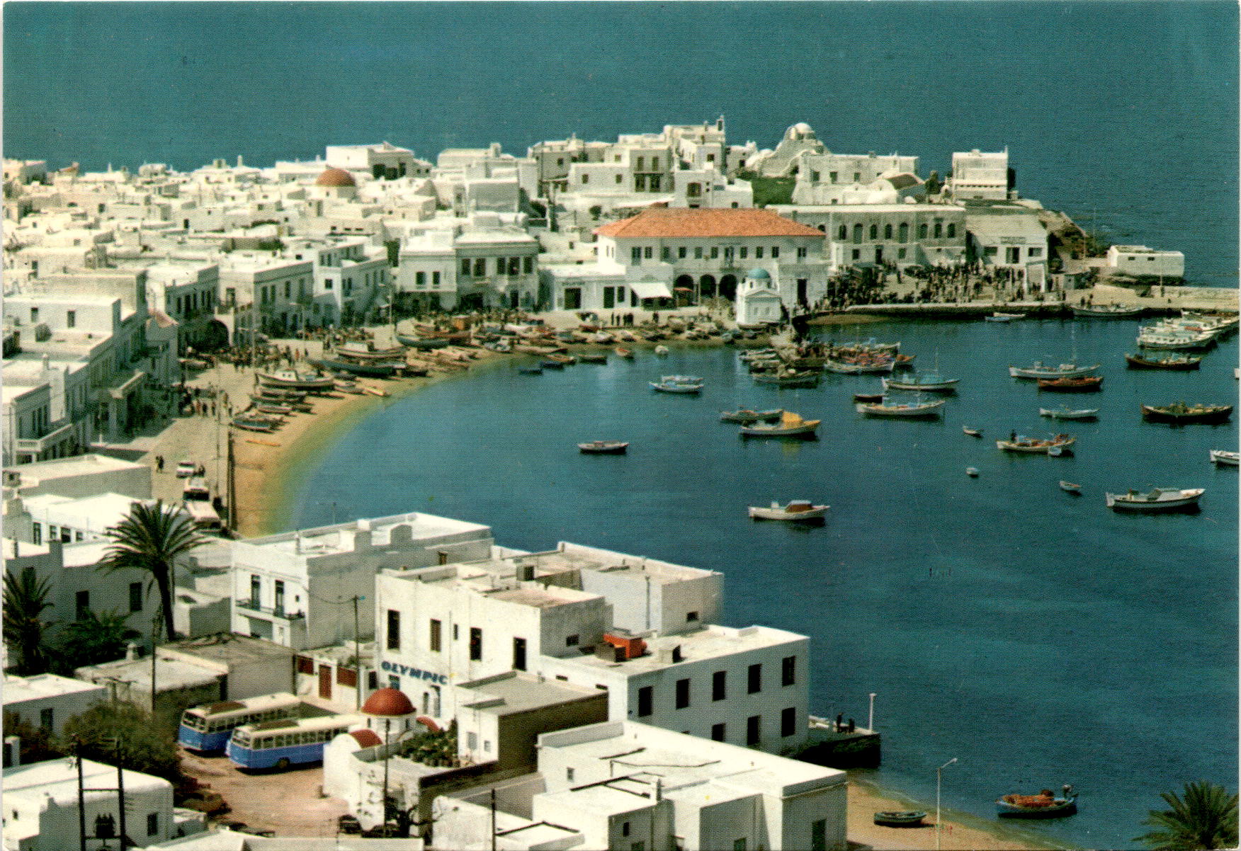 Back of PostcardThe text is advertising a panoramic view of Mykonos, with the address being B. Isaiah – Eupolidos 12 in Athens. The phone number provided is 3245479. The text is written in multiple languages, including Greek, English, French, and Spanish.