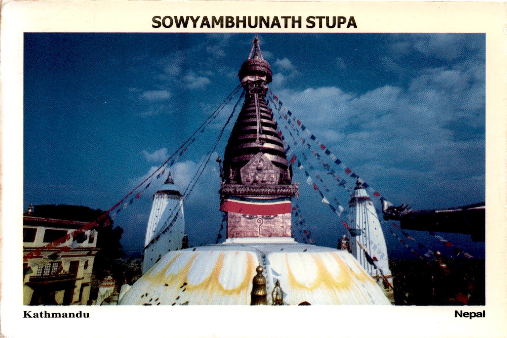 The postcard features a picture of the famous Sowyambhunath Stupa in Kathmandu, Nepal. The stupa holds great cultural and religious significance in the region. It is a popular tourist attraction and a symbol of Nepal’s rich history and heritage. The image on the postcard captures the beauty and grandeur of the stupa, showcasing its intricate architecture and spiritual aura. The postcard is sent via airmail, indicating its importance and value as a souvenir or keepsake. The Sowyambhunath Stupa is a place where people from all walks of life come to pray, meditate, and experience a sense of peace and tranquility. It serves as a reminder of the spiritual and cultural traditions that are deeply rooted in Nepalese society.