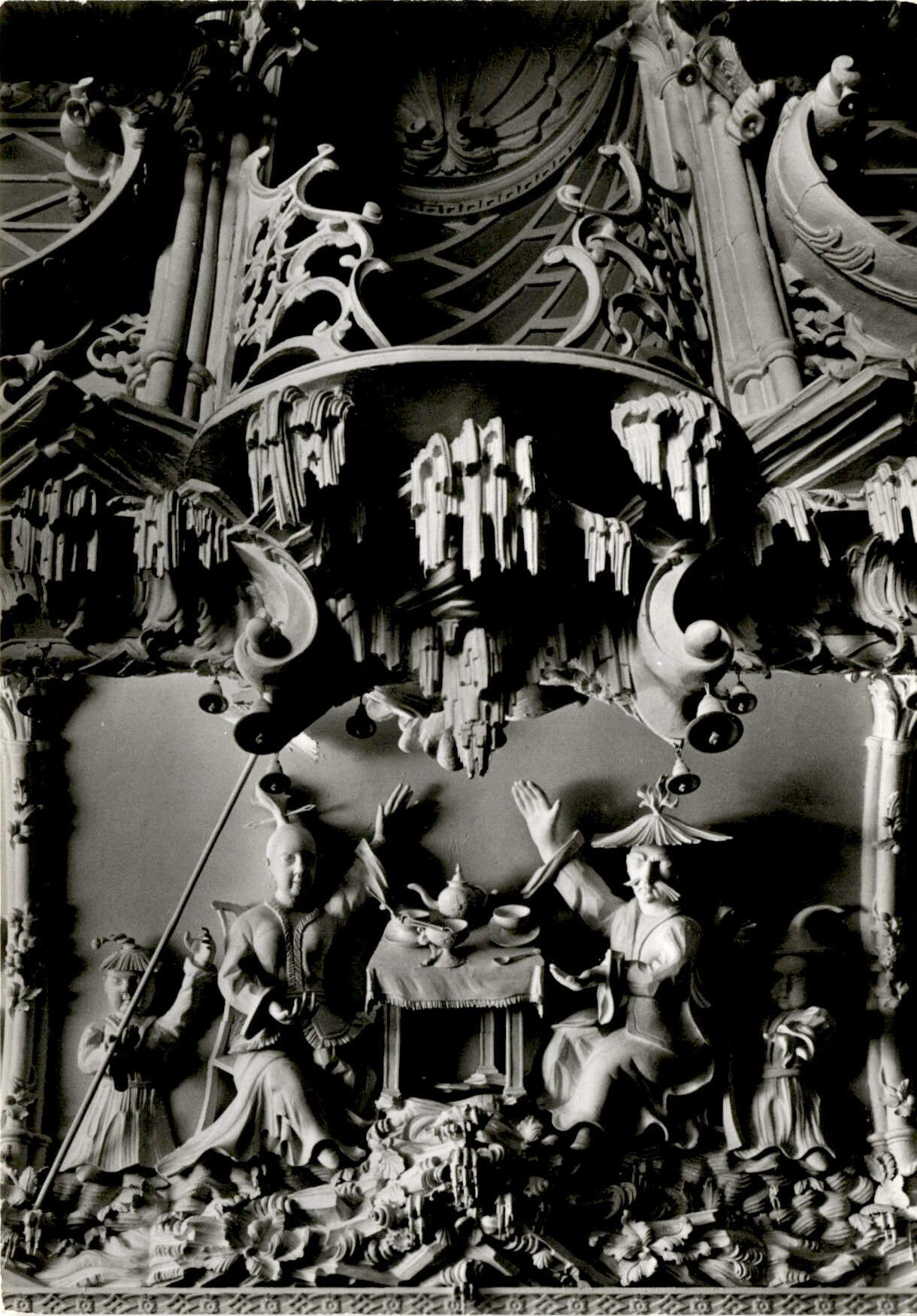 This postcard features a Chinese-style wood-carving in Claydon, Buckinghamshire, known as The Tea Party, carved in the 1760s by Mr. Lightfoot. The carving is located in the Chinese Room alcove and is considered the most charming and famous of all Claydon’s wood-carvings. Mr. Lightfoot, an eccentric genius, is known for his unique work at Claydon. The postcard captures the cultural and historical significance of this artwork, showcasing the intricate details and craftsmanship of the carving. The image by Edwin Smith highlights the beauty and artistry of the wood-carving, emphasizing its social and cultural value as a unique piece of art in Claydon.