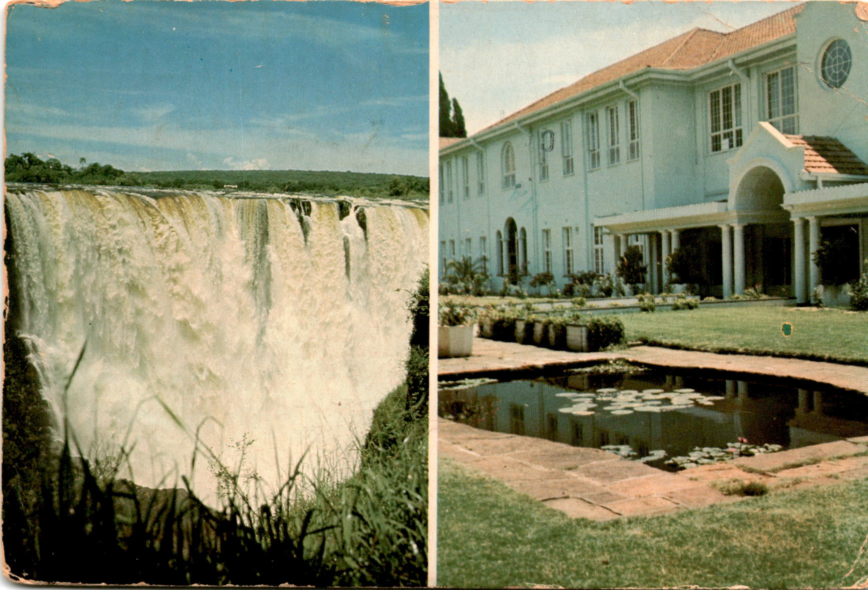 The postcard describes a visit to Victoria Falls, where the sender stayed at the Meikles Southern Sun Hotel and saw the falls. They also spent time at Wankee Safari Lodge, observing animals at a water hole. The postcard mentions the hot weather and expresses excitement about seeing more sights. The sender also references the Victoria Falls Hotel and includes a picture of the falls. The postcard was published by Rhomark and includes cultural references to Kenya. The recipient, Mrs. Connie Dreher, is associated with Gladieux Food Services in Toledo, Ohio. The postcard holds social and cultural value as it captures the sender’s travel experiences and connections to different places.