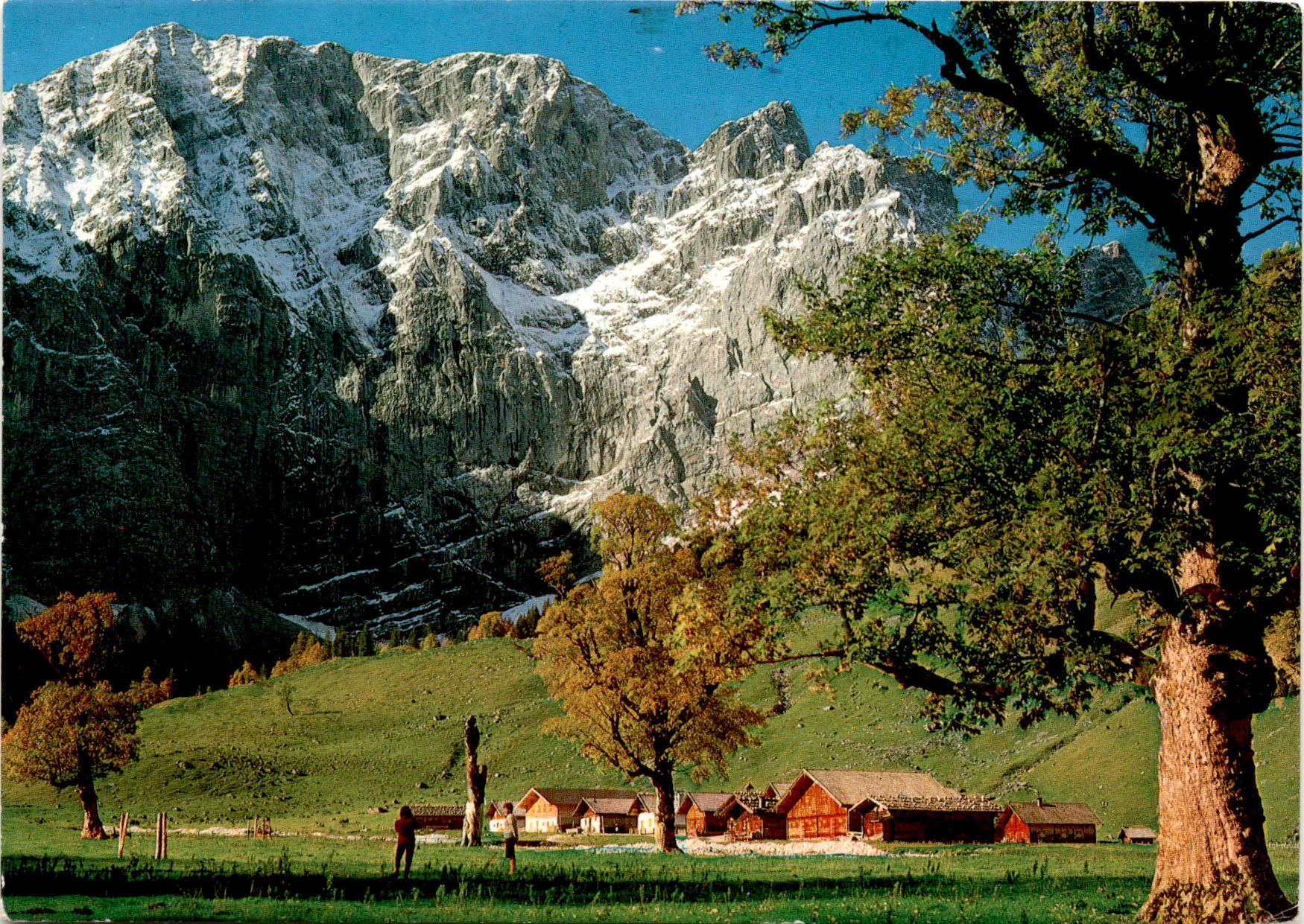 The postcard depicts a picturesque scene in the mountains of the Karwendelgebirge, showcasing the beauty of nature at Eng-Almen am Großen Ahornboden. The sender, Bill, expresses admiration for the greenery and hopes that all is well. The postcard is from 1996 and was produced by Fotoverlag Huber in Garmisch-Partenkirchen. It also includes a reference to Weymouth and Virginia Apgar, a physician known for developing the Apgar Score used to assess the health of newborn babies. This postcard holds cultural value as it captures a moment in time in a scenic location, while also referencing historical figures and places that have significance in the medical field.