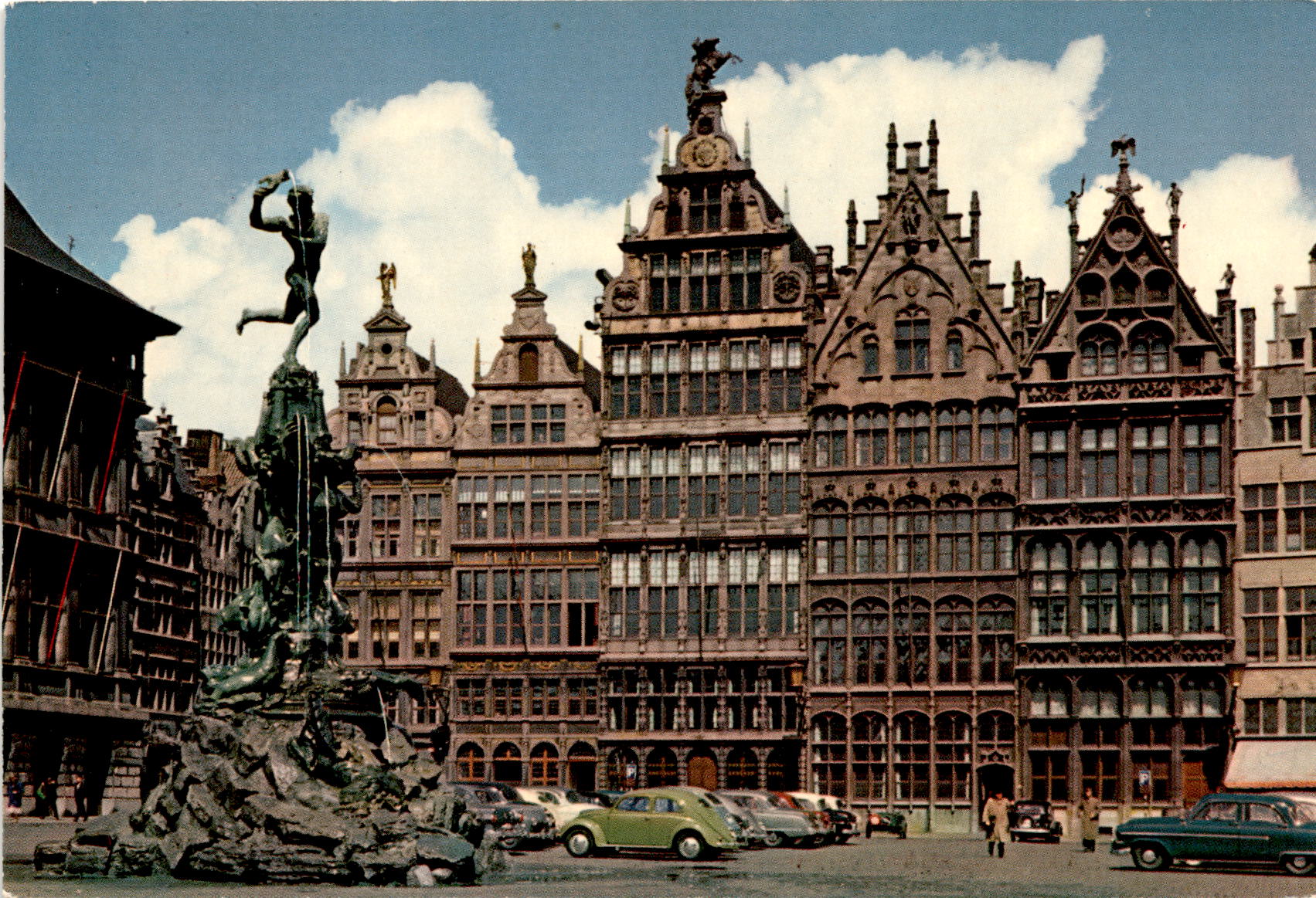 The postcard depicts the iconic statue of Brabo in Antwerp, surrounded by the historic Corporation Houses. Brabo is a legendary figure in Antwerp’s folklore, known for throwing a giant’s hand into the Scheldt River. The Corporation Houses are traditional guild buildings that once housed various trade associations in the city. These structures hold significant social and cultural value, representing the history and heritage of Antwerp’s merchant guilds. The postcard captures the essence of Antwerp’s rich cultural heritage, showcasing both the iconic statue of Brabo and the historic Corporation Houses that have played a vital role in the city’s economic and social development. It serves as a reminder of Antwerp’s vibrant past and its enduring connection to its guild traditions.