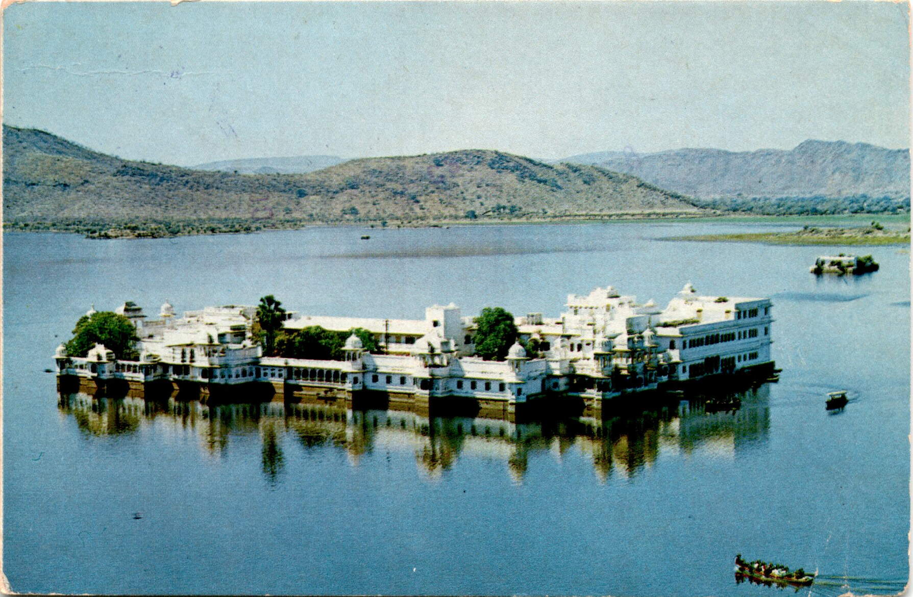 The postcard depicts a traveler enjoying breakfast at the Lake Palace Hotel in Udaipur, India, with a view of the lake. The hotel, once a Summer Palace, holds historical and cultural significance. The traveler mentions exploring the area and having a great time with their group. The postcard is sent from Calcutta, India, to a postcard collector in Ohio, USA. The mention of the hotel, the picturesque location, and the traveler’s experiences highlight the social and cultural value of the destination. The postcard serves as a memento of the traveler’s visit to a luxurious and historically significant location in India.