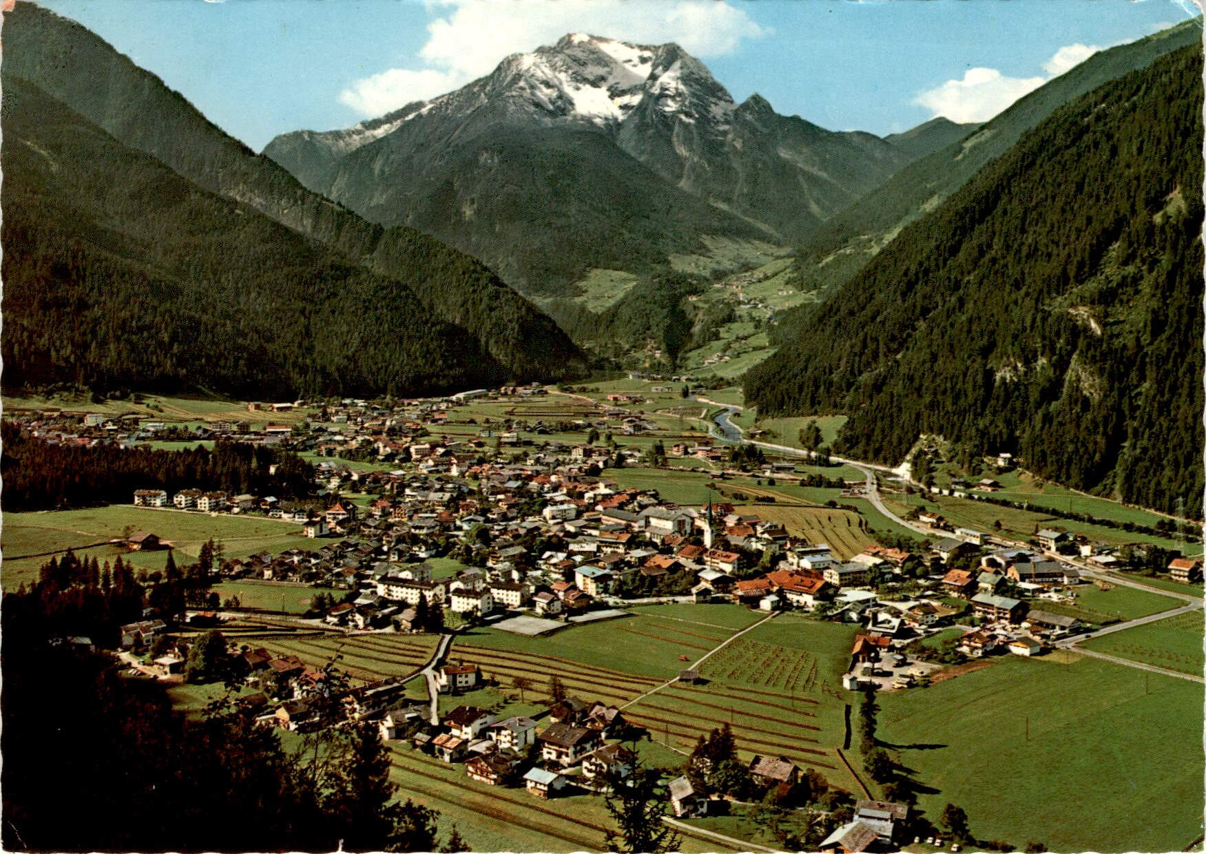 Back of PostcardThis postcard is from Mayrhofen, a popular international summer and winter sports destination in the Zillertal Valley, Tirol. It highlights the social and cultural significance of the town as a hub for both society and sports. The postcard features a colorful image of the town and is sent with greetings to friends in Switzerland. The sender mentions the beautiful journey to Mayrhofen and hopes for good weather. The postcard captures the essence of the town as a place where people come together to enjoy outdoor activities and socialize. It reflects the value of Mayrhofen as a destination that holds importance for both locals and visitors alike.