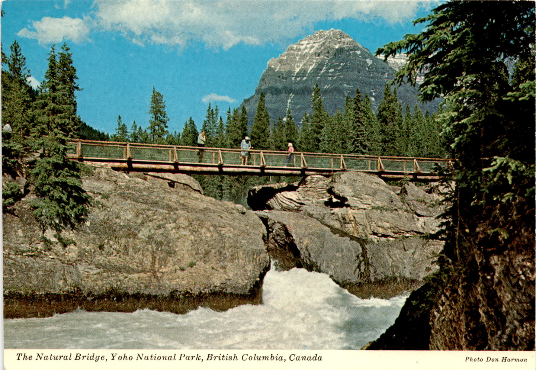 This postcard showcases the Natural Bridge in Yoho National Park, British Columbia, Canada, capturing the beauty of the Canadian Rockies. The image of the natural bridge formed by the Kicking Horse River cutting through the cliff is a testament to the power of nature. The presence of Mount Stephen in the background adds to the majestic scenery. The postcard, distributed by Byron Harmon Photos in Banff, Alberta, Canada, holds cultural value as it highlights the natural wonders of the country. It serves as a memento for tourists and travelers, showcasing the unique landscapes and landmarks of Canada. The postcard, with its picturesque view and cultural significance, is a representation of the beauty and grandeur of the Canadian wilderness.