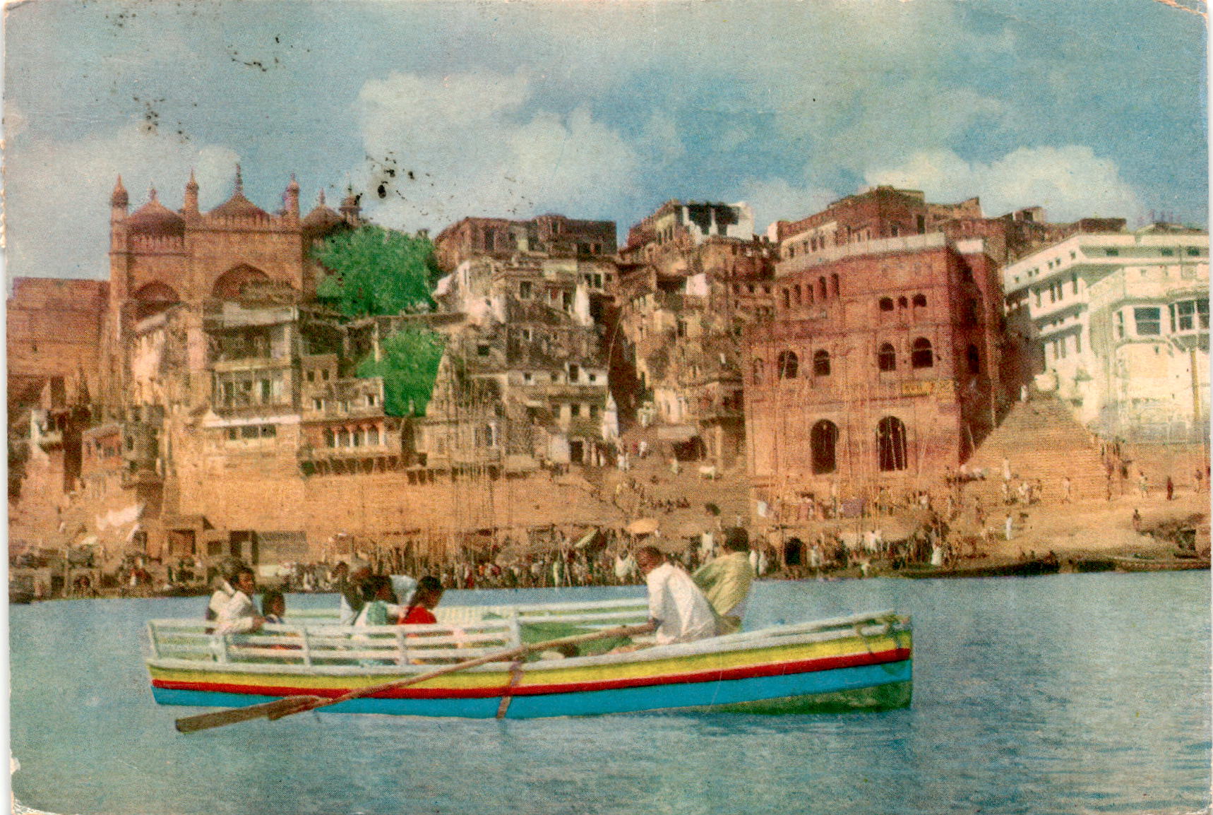 Back of PostcardThe postcard depicts the Panchaganga Ghat in Varanasi, India, a significant location where Hindu pilgrims come for holy water and where the dead are cremated. The postcard highlights the cultural and social value of this place, showcasing the religious practices and rituals that take place there. The postcard also mentions a visit to the birthplaces of Buddha and Gita, as well as an exhibition. The text on the postcard emphasizes the beauty and fascination of the sights in Varanasi, making it a truly great destination for visitors. The postcard is sent from India to the USA, indicating the global appeal and interest in the cultural and religious significance of Varanasi.