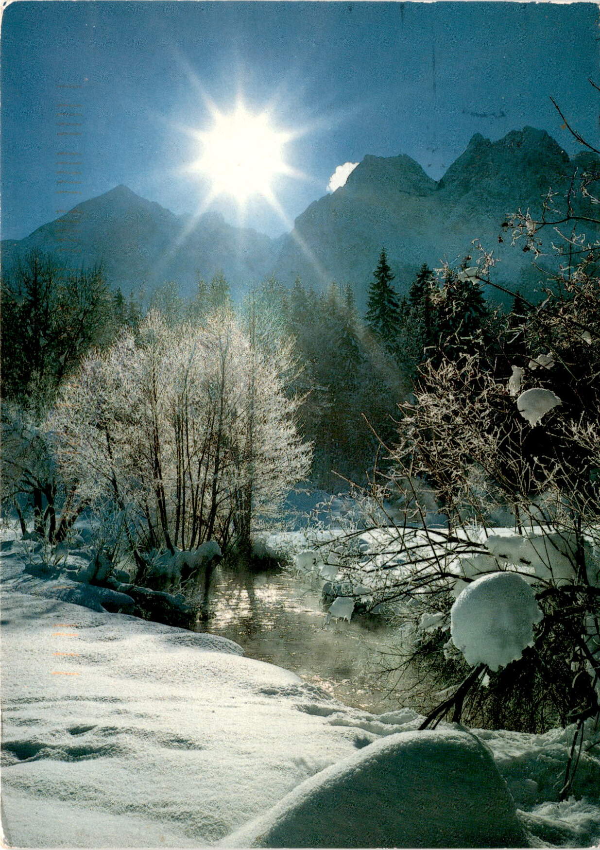 The postcard depicts a winter scene in the mountains with real snow covering the landscape. The sender, Bill, is glad to be in the mountains and mentions teaching in another direction. The postcard is from Fotoverlag Huber in Garmisch-Partenkirchen, a location known for its picturesque mountain views. The mention of Old Glory and USAG suggests a patriotic or American theme. The postcard is being sent at a postcard rate to Weymouth, Massachusetts, indicating a connection between the sender and recipient. Overall, the postcard captures the beauty of winter in the mountains and hints at cultural and social connections between different places.