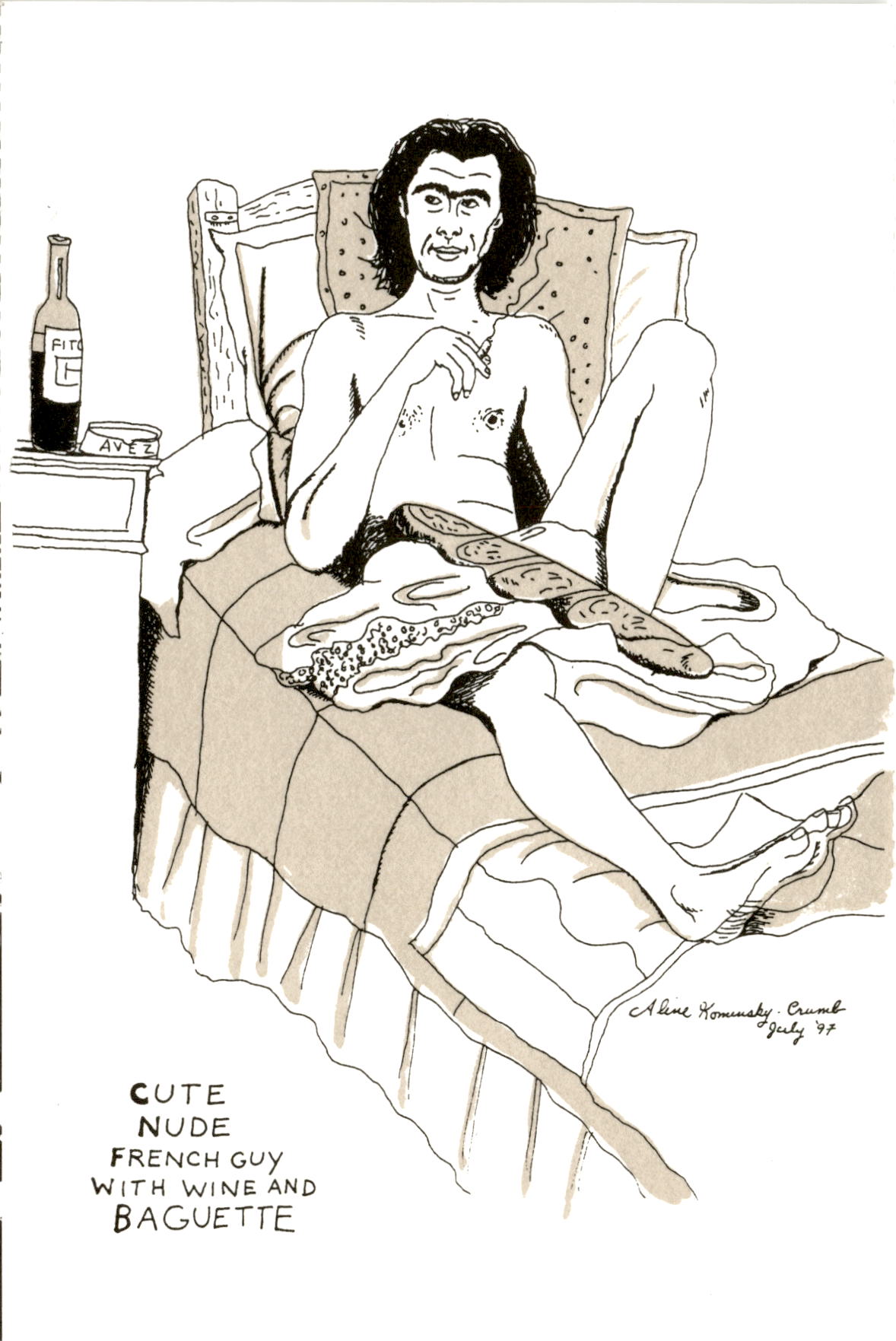 FITO HAVEZ CUTE NUDE FRENCH GUY WITH WINE AND BAGUETTE Alime Komunaly guly Crumb 97 KSP Postcard No. 142 Aline Kominsky-Crumb Six Nudes With Baguettes 1997 Artwork For a FREE catalog of Kitchen Sink Press products books and posters 1-800-365-7465 www.kitchensink.com