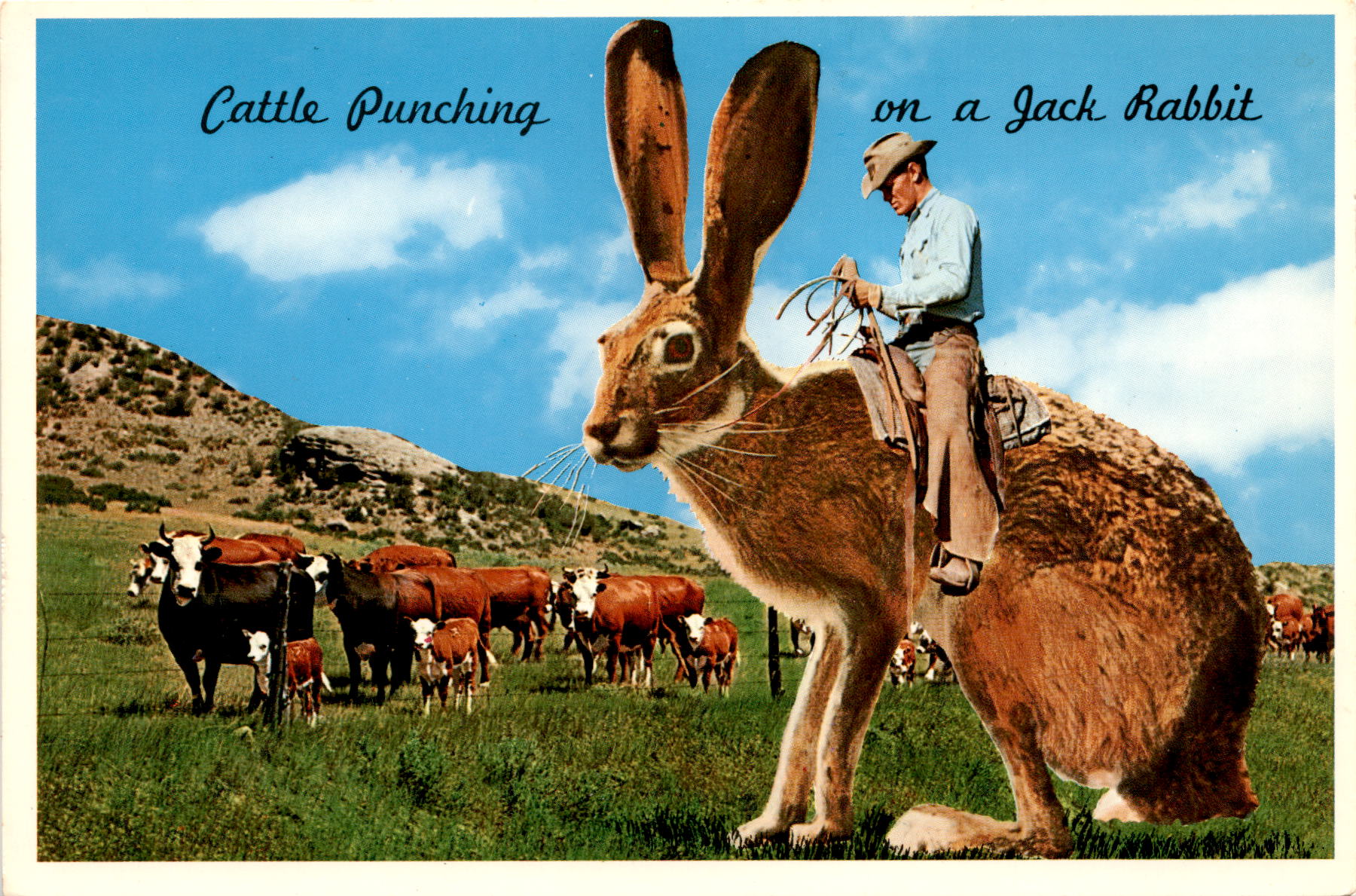 Have you ever heard of using a Jack Rabbit for cattle punching? It may sound unusual, but some cowboys actually prefer it over using their favorite Bronc. In this postcard from Petley Studios, we see a cowboy in action, using a Jack Rabbit for cattle punching.