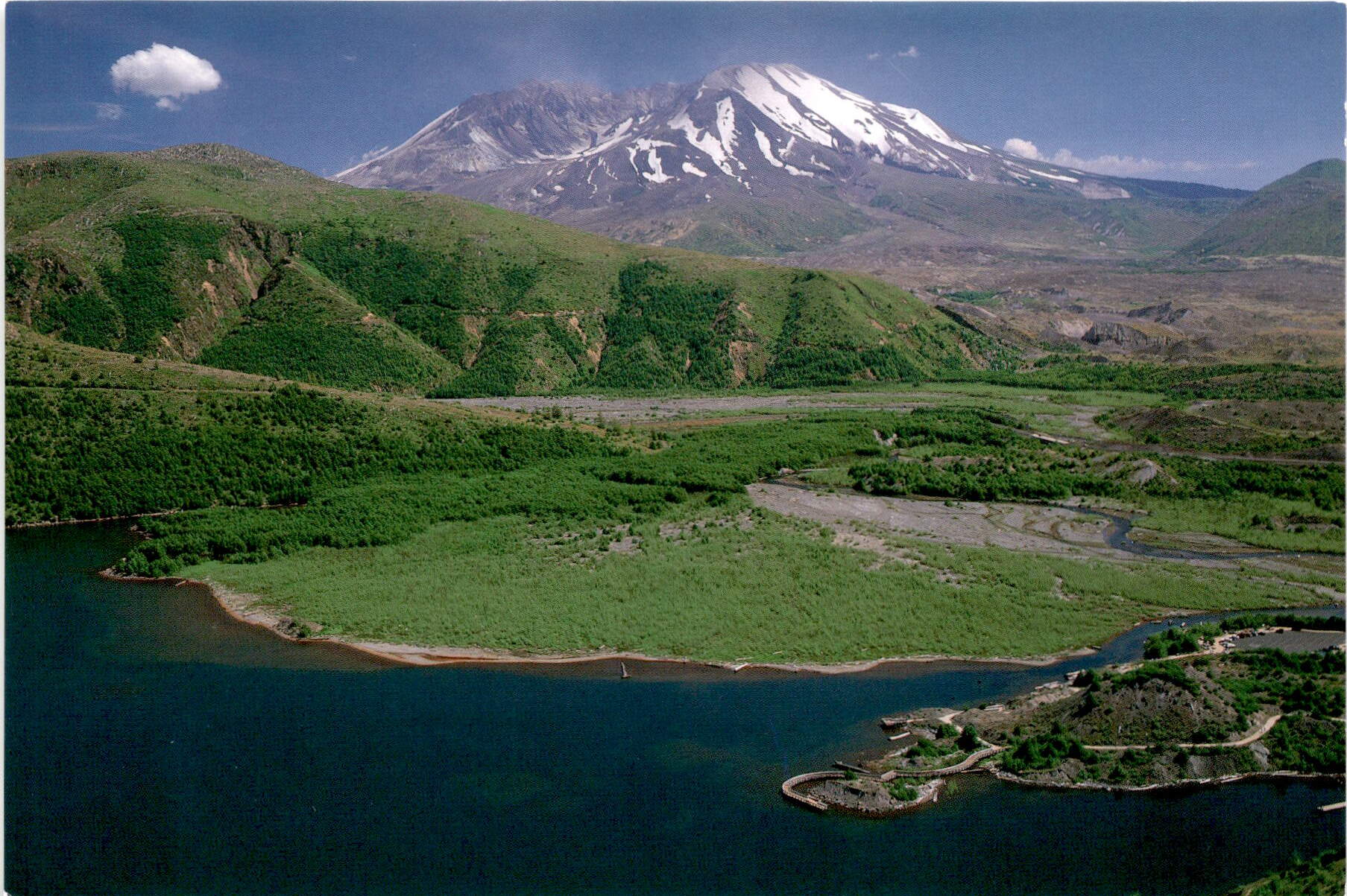 The photo on this postcard, taken by Charles Adams, captures the beauty and grandeur of Mount St. Helens. From its snow-capped peak to its lush forests and rugged terrain, this volcano is a sight to behold.