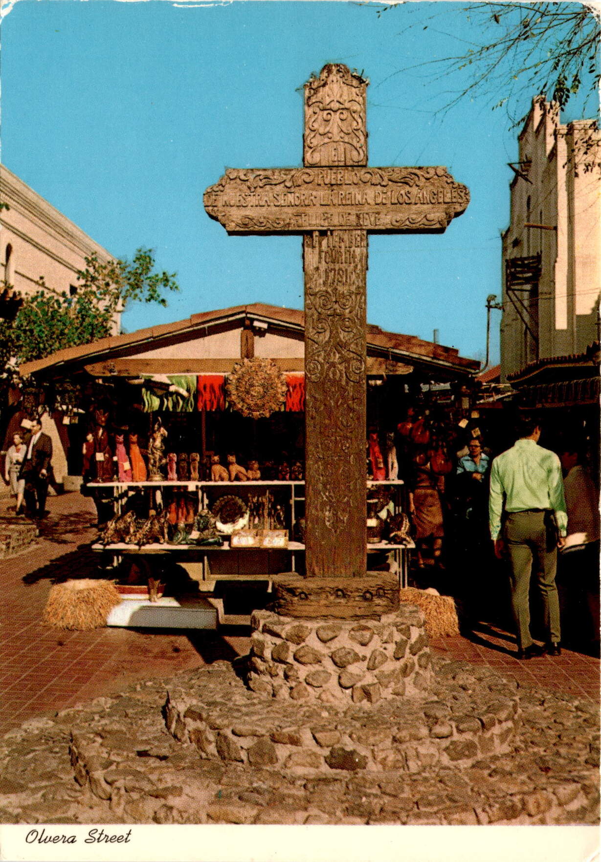Olvera Street in Los Angeles, California is a place steeped in history and culture. This postcard, dedicated to commemorating the founding of Los Angeles, showcases the Historical Cross on Olvera Street. The hand-carved inscription reads: