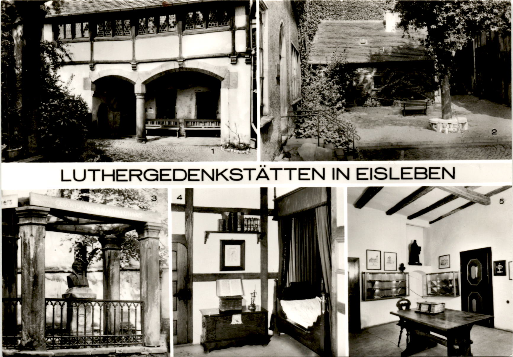 1445 Apr LUTHERGEDENKSTÄTTEN IN EISLEBEN 2 5 59 Lutherstadt Eisleben 1 Luthers Geburtshaus – Hofseite 2 Luthers Sterbehaus – Hofseite 3 und 5 Luthers Geburtshaus 4 Schlafraum in Luthers Sterbehaus DDR 0.25 M BILD UND HEIMAT REICHENBACH (VOGTL) BEK III/18/197 A 1/B 751/79 Echt Foto 01 08 05 169