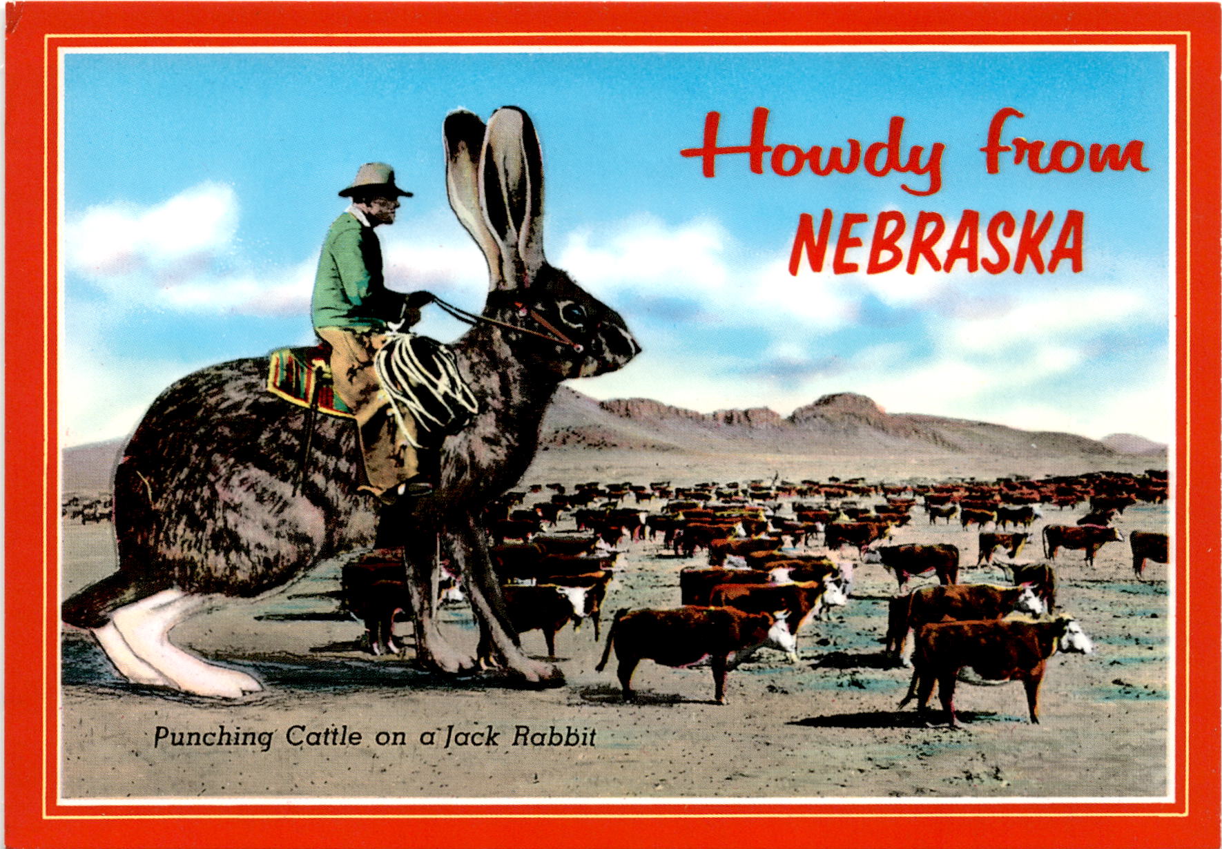 Greetings from the wild west, where cowboys still roam the open range and punch cattle. Some do it on Broncs, while others, as you can see from this postcard, do it on the lowly Jack Rabbit.