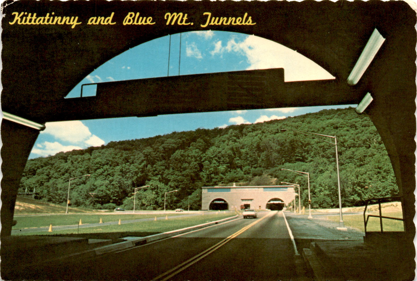 The color photo on this postcard, courtesy of the Penna. Turnpike Commission, captures this stunning view perfectly. From the rocky terrain to the lush greenery, it’s a snapshot of the beauty that surrounds these tunnels.