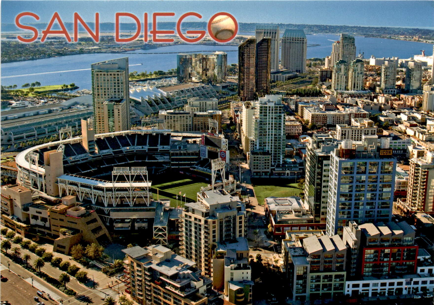 If you’re looking for a stunning view of downtown San Diego, look no further than this postcard featuring an aerial shot of the city. From this vantage point, you can see the iconic Petco Park in the foreground, a must-visit destination for any baseball fan.