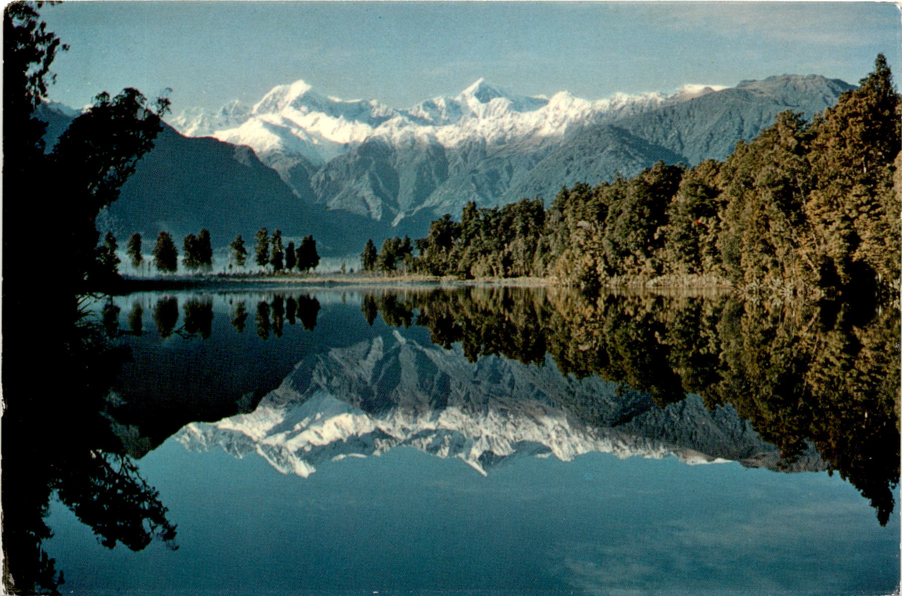 Welcome to Lake Matheson, a stunning location in New Zealand where you can see the reflection of Mt. Tasman and Mt. Cook, the two highest mountains in the country. This picturesque spot is located near Fox Glacier in South Westland, offering visitors a breathtaking view of the snow-capped peaks mirrored in the tranquil waters of the lake.