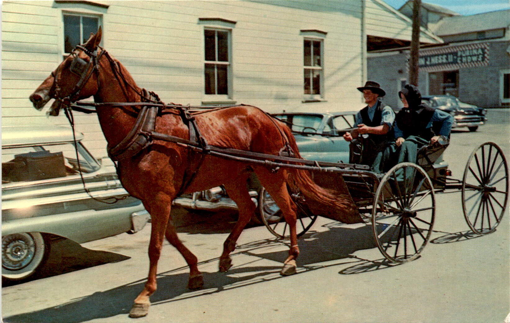 The postcard I received depicts a beautiful scene of an Amish man and his wife traveling into town in a horse and buggy. The Amish are a religious sect of people who have preserved many of their ancestors’ customs and traditions. They make their living primarily through farming, without the use of modern conveniences.