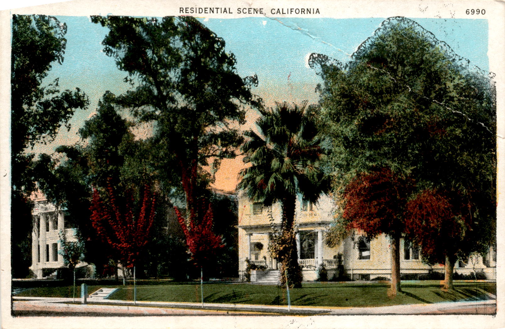 This postcard captures a beautiful residential scene in the Golden State. The palm trees, blue skies, and charming houses all come together to create a picturesque view that is quintessentially Californian.