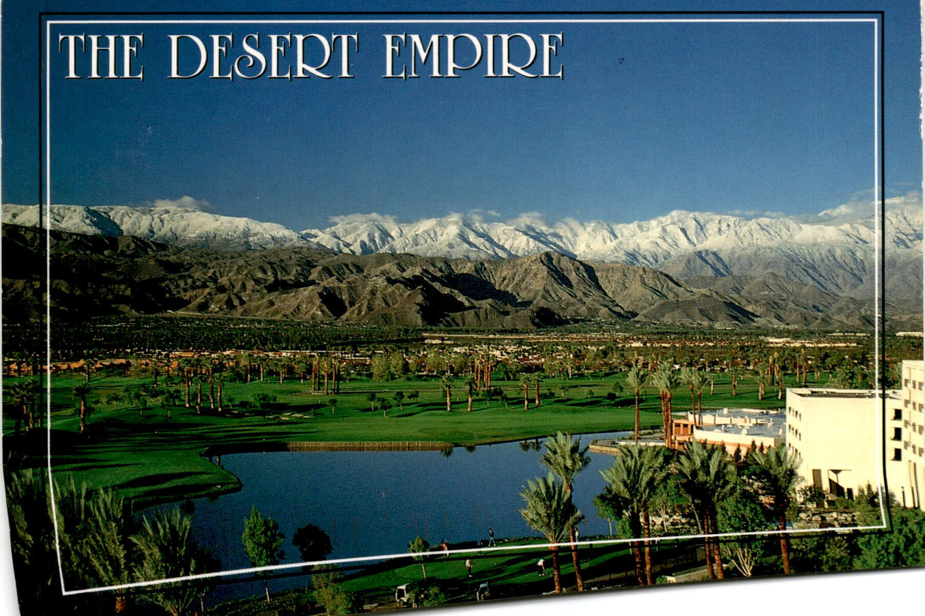 The postcard from THE DESERT EMPIRE captures the stunning beauty of the Palm Springs-Palm Desert area, as seen from the Marriott Desert Springs. The panoramic view showcases everything from lush golf courses to majestic mountains, creating a truly breathtaking scene.