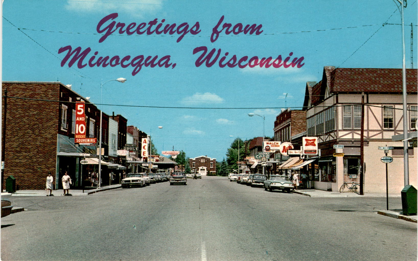 This postcard captures a charming street scene in the heart of Minocqua, a picturesque town known for its beautiful lakes and outdoor recreation opportunities. As you can see, the town offers a variety of shops and services, from souvenirs and drugs to hardware and more.