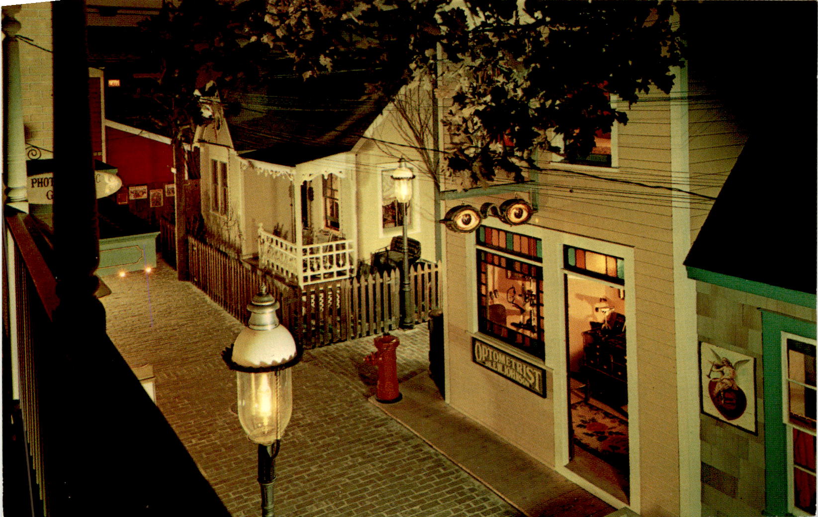 Step back in time and experience the charm of Old Milwaukee at the Milwaukee Public Museum! This postcard captures the essence of a bygone era, where visitors can stroll down gaslit streets and admire a Victorian house. The brick-paved Grand Avenue is lined with quaint shops, including a toy shop, candy store, and the Haymarket Square Gift Shop.