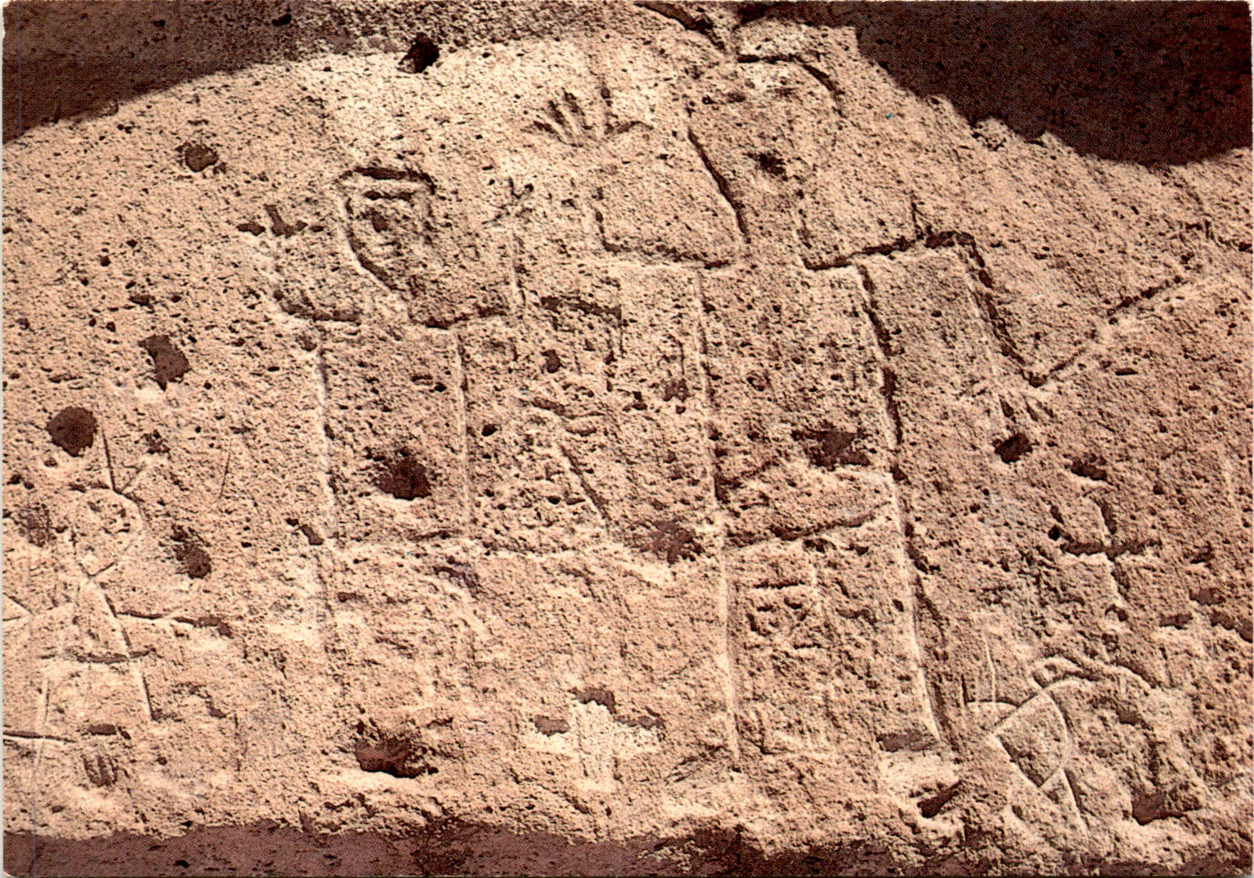 The postcard features Petroglyphs at Bandelier National Monument in Frijoles Canyon, New Mexico. These symbols and figures were cut into the rocks by prehistoric Indians, with the menacing figures at Tsankawi ruins believed to have been meant to frighten away intruders.