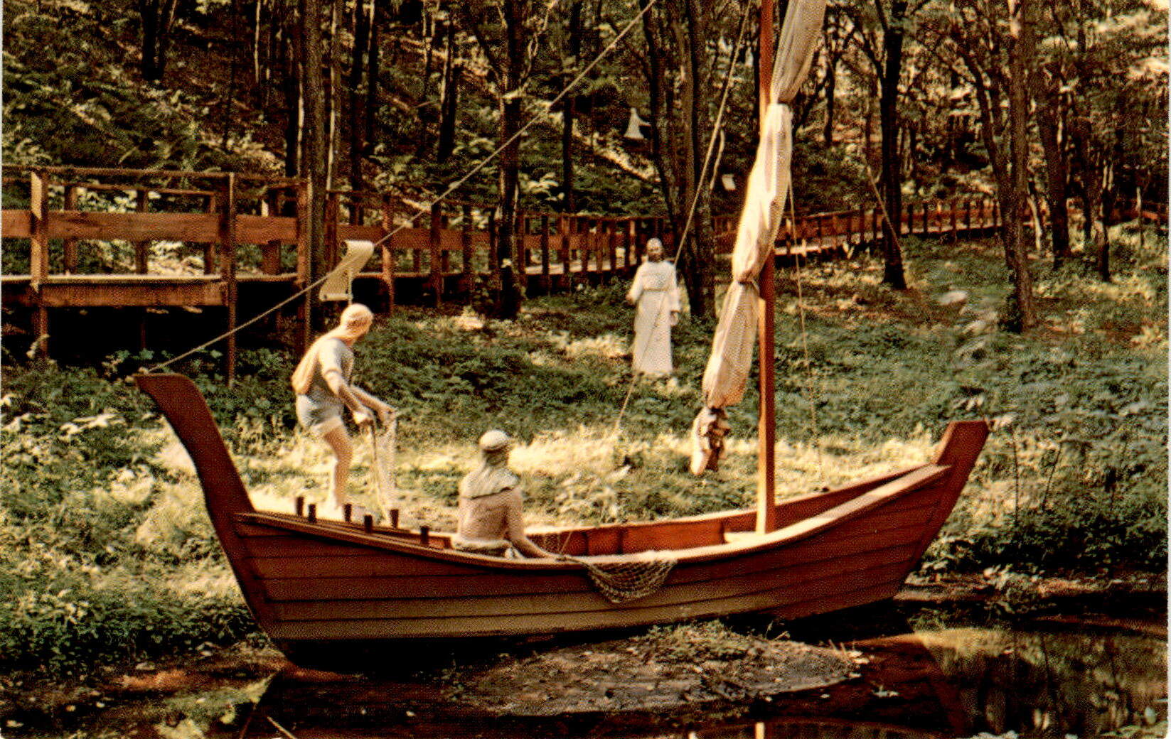 The postcard depicts a scene from the Biblical Gardens between Wisconsin Dells and Lake Delton, Wisconsin. The image shows Jesus calling his first disciples with the quote from St. Mark 1:17, “And Jesus said unto them, ‘come ye after me and I will make you to become fishers of men’.”