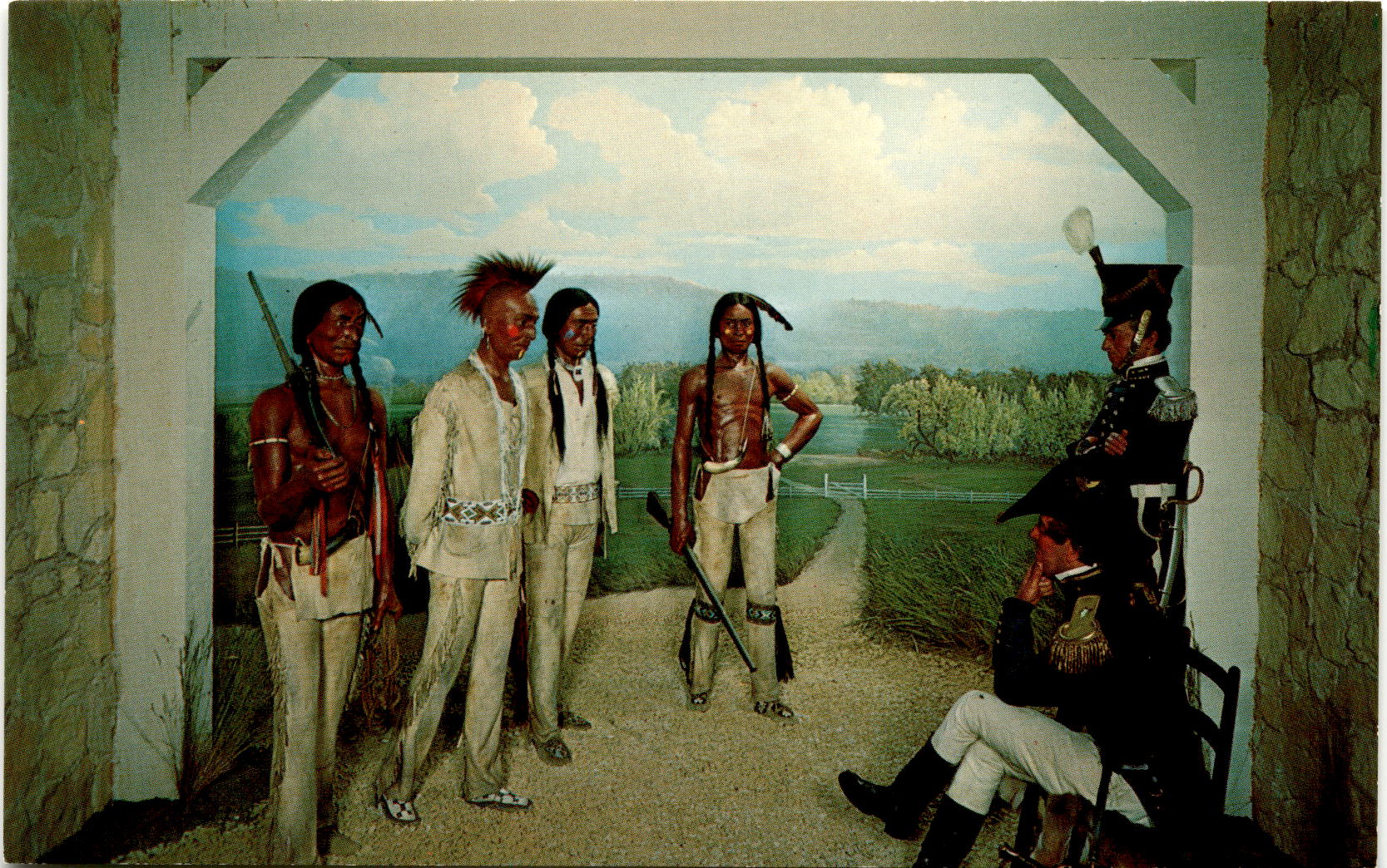 The postcard features a diorama of Black Hawk at the Milwaukee Public Museum in Milwaukee, Wisconsin. Black Hawk, a Sauk Indian leader, led his people to Illinois and Wisconsin in protest of their lands being taken. The conflict that ensued ended in 1832 with Black Hawk surrendering.