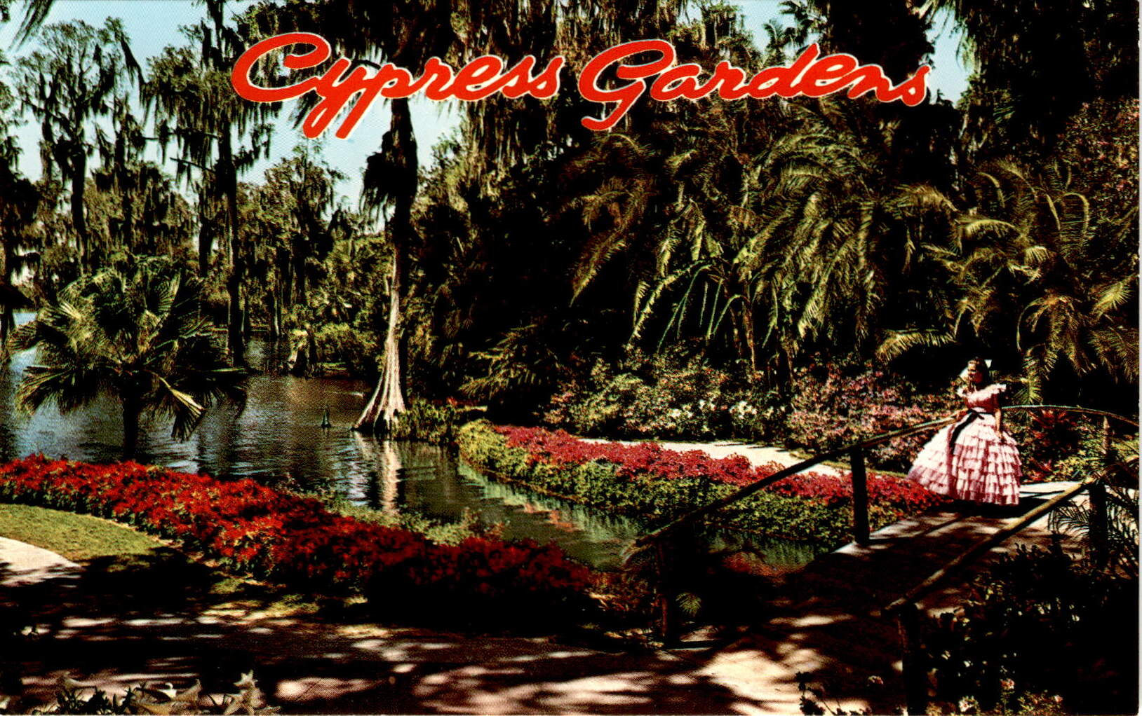 The postcard showcases Cypress Gardens in Florida, a beautiful and picturesque setting filled with a variety of plants and trees from around the world.