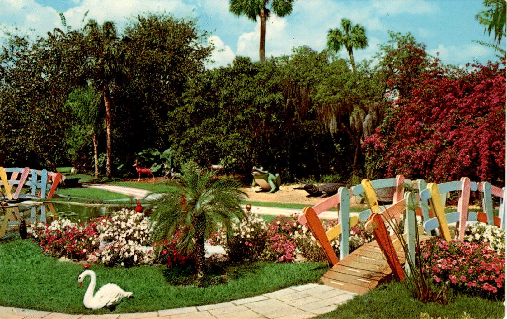 The postcard features a colorful image of Florida’s Cypress Gardens, known as “Fabulous Fantasy Valley.” It is designed for the young at heart and showcases the beauty of the gardens in vibrant Curteich color.