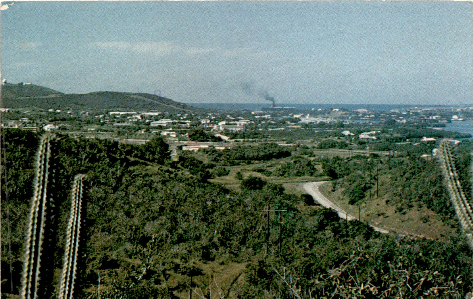 The postcard depicts a bird’s eye view of the rolling terrain, Cuban cactus, low-green vegetation, and some homes located on the United States Naval Base Guantanamo Bay, Cuba. The sender mentions the hot and humid weather, but also notes that it breaks up the monotony. The postcard is signed by Diana and mentions Buffalo Bill Cody.