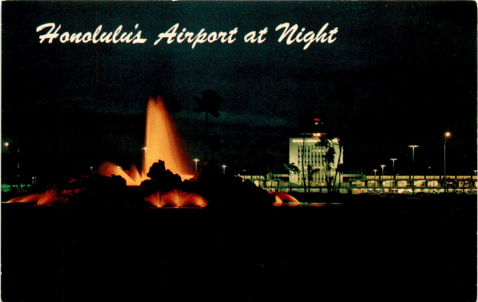 The postcard depicts Honolulu’s new airport at night, with a beautiful jet airport sparkling like a jewel. In the foreground, there is a spectacular lava rock fountain resembling an erupting Hawaiian volcano at the main entrance to the airport.