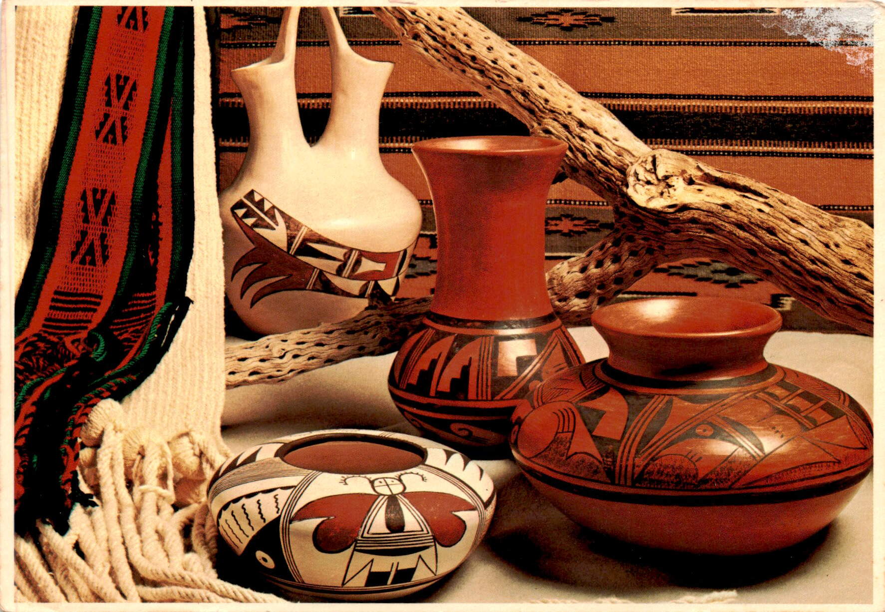 Back of PostcardThe postcard features a photo of Hopi pottery, including a Hopi Wedding Belt and a Sash Belt framing the graceful shapes of the pottery. The pottery ranges from butterfly bowls and wedding vases in buff white to stunning red polychrome pieces, all traditional in form and patterns. The wedding belt and sash are worn by Kachinas in dances and ceremonies.