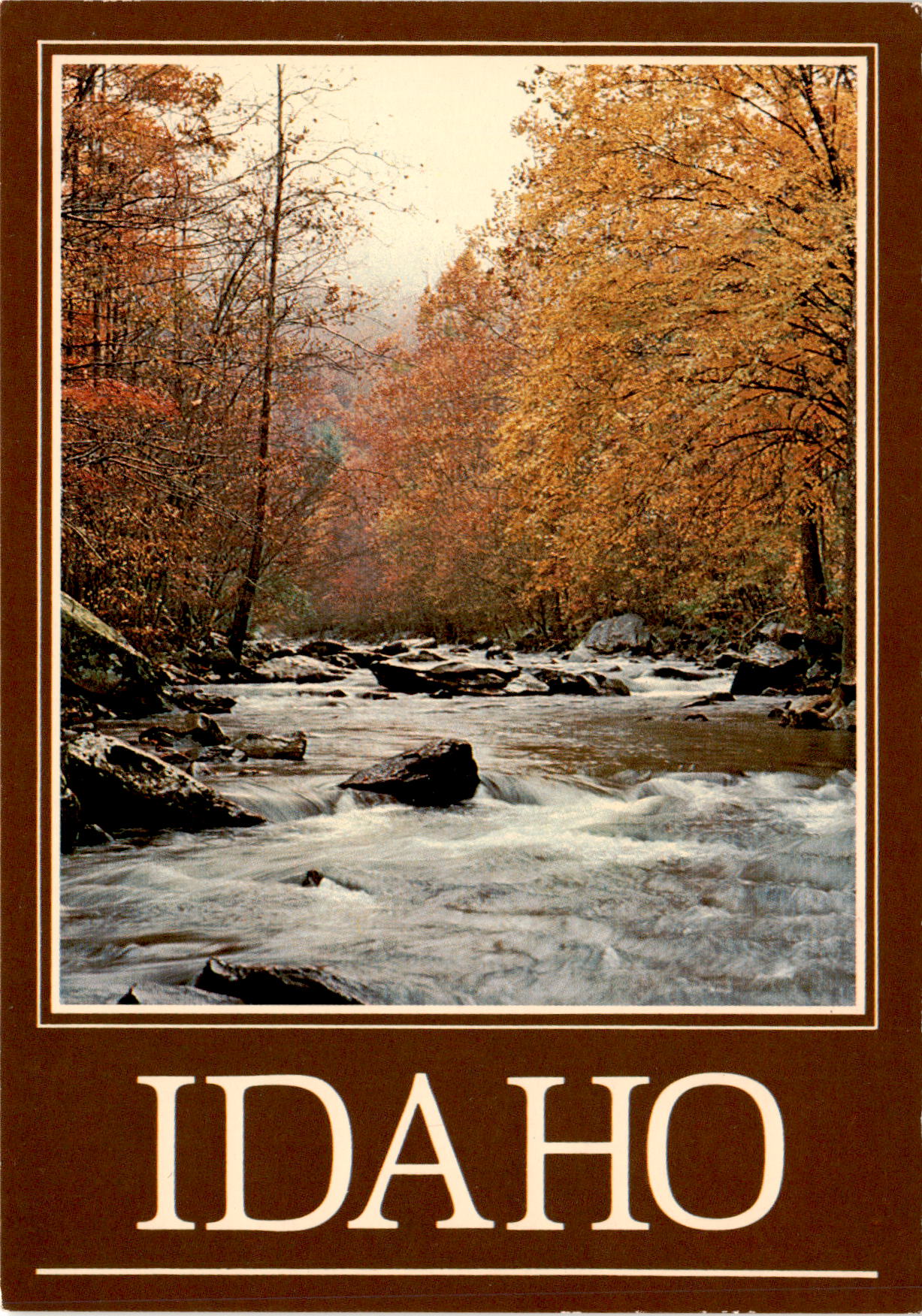 The postcard features a print of autumn along the river in Idaho, published by Great Mountain West Supply, Inc. The photo was taken by Dick Cunningham and printed in Ireland.
