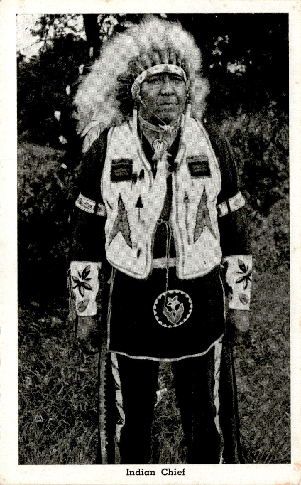 The postcard features an image of Indian Chief Essage and is addressed to Siamp.
