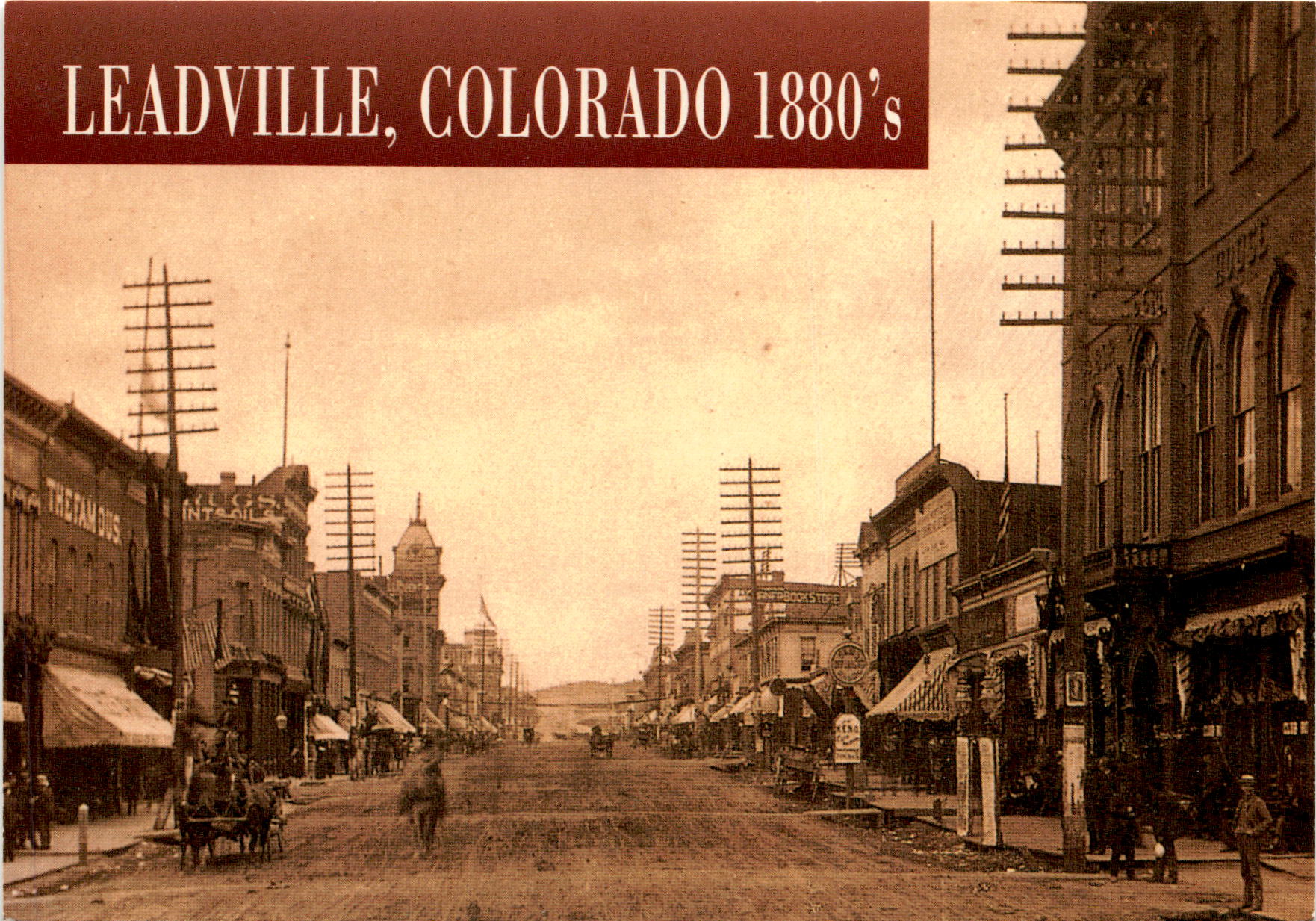 The postcard depicts Harrison Avenue in Leadville, Colorado in the 1880s, a bustling street filled with politicians, prospectors, lawmen, outlaws, prostitutes, preachers, miners, and madams. The image shows H.A.W. Tabor’s opera house on the right and Hyman’s Saloon on the left, which was frequented by Doc Holliday.